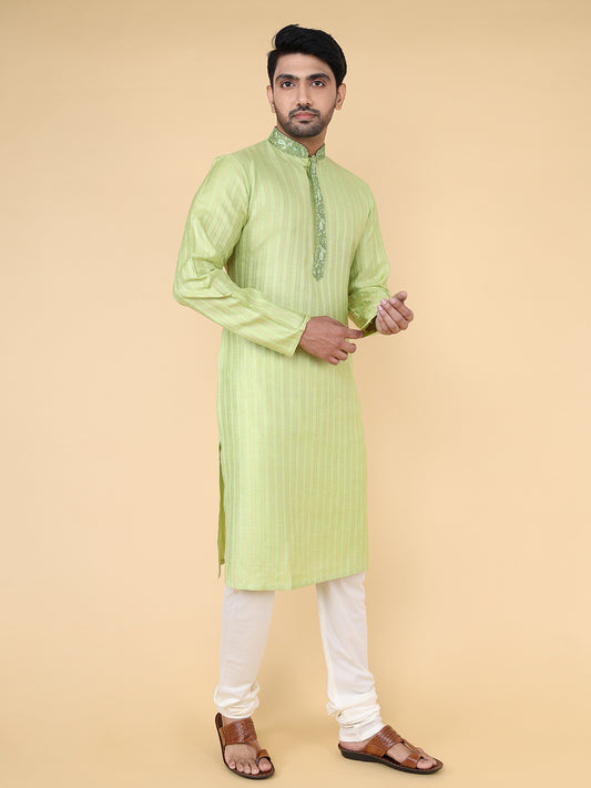 Full Sleeve Self Design Kurta and Pyjama Set in Green Pure Cotton