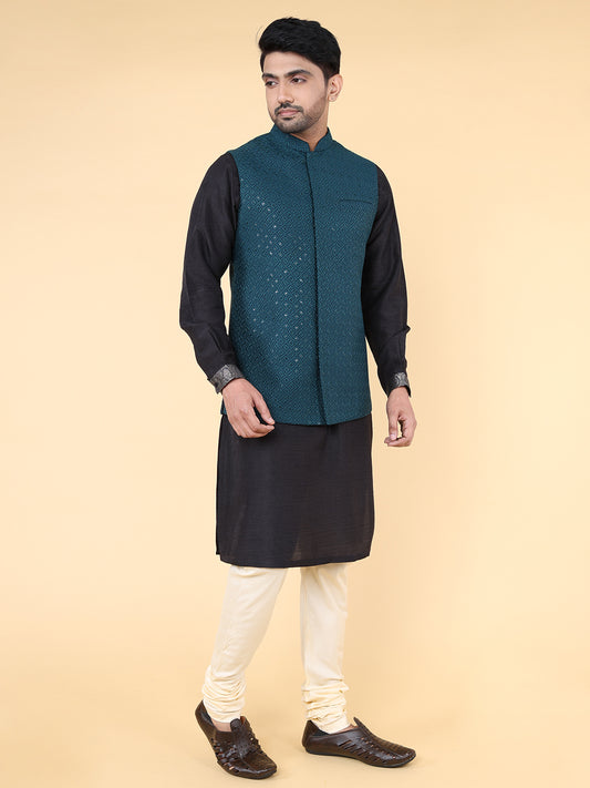 Full Sleeve Self Design Kurta and Pyjama Set in Green Silk Blend