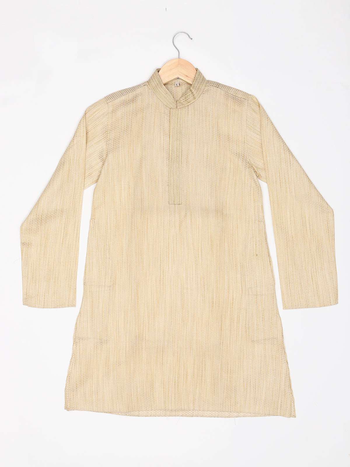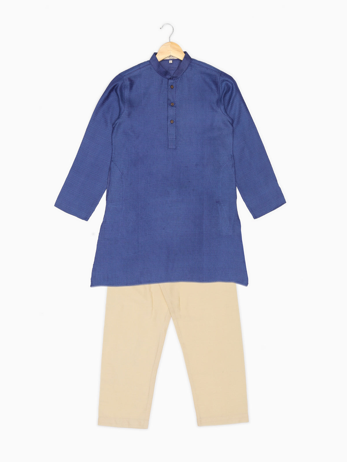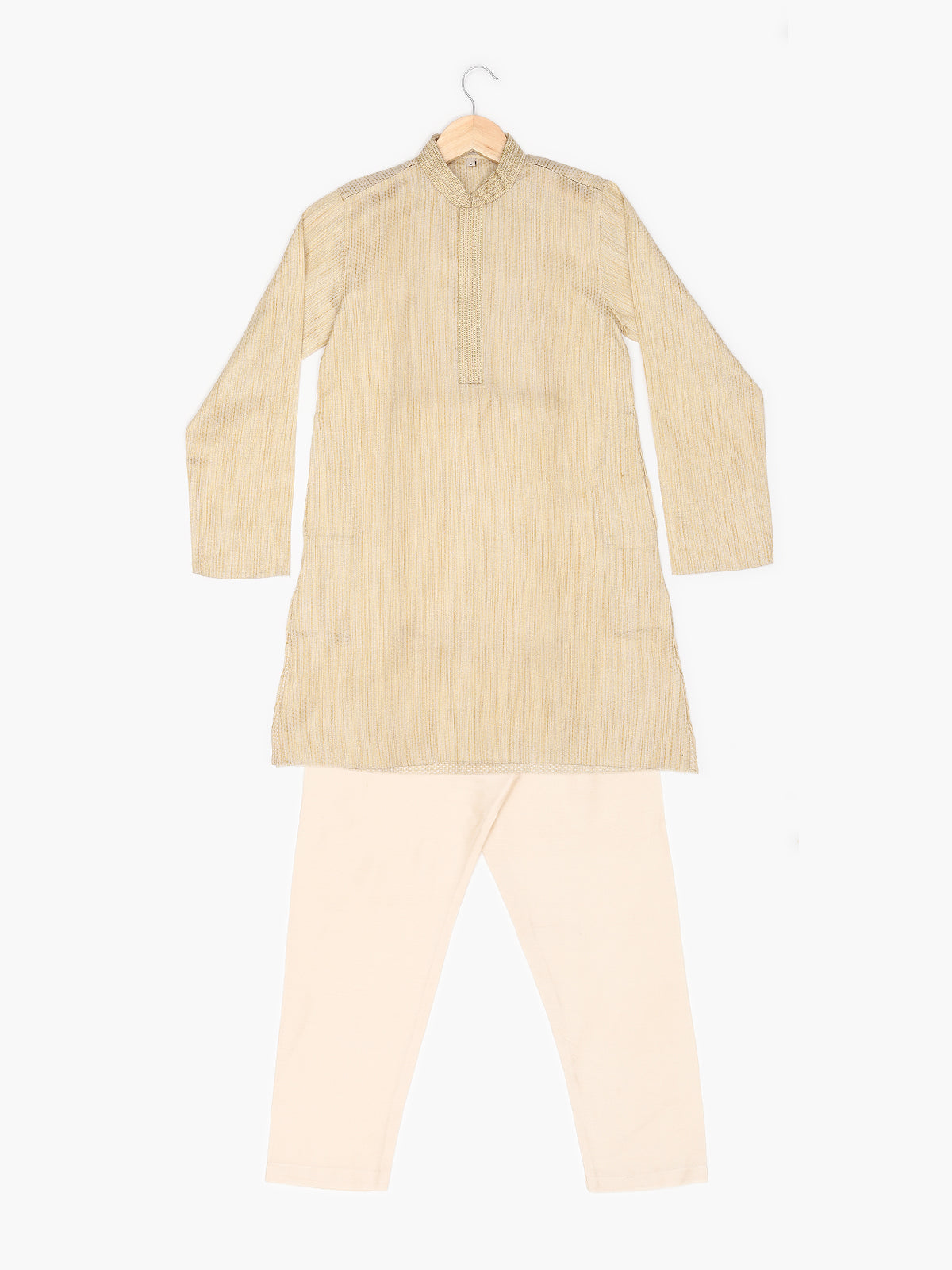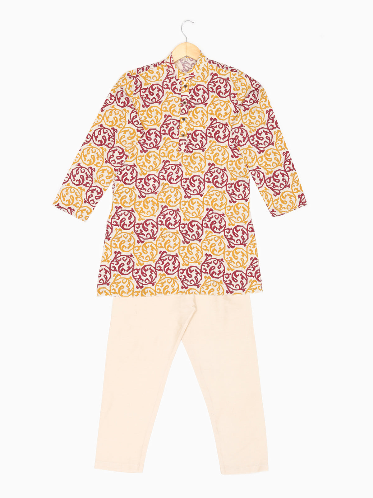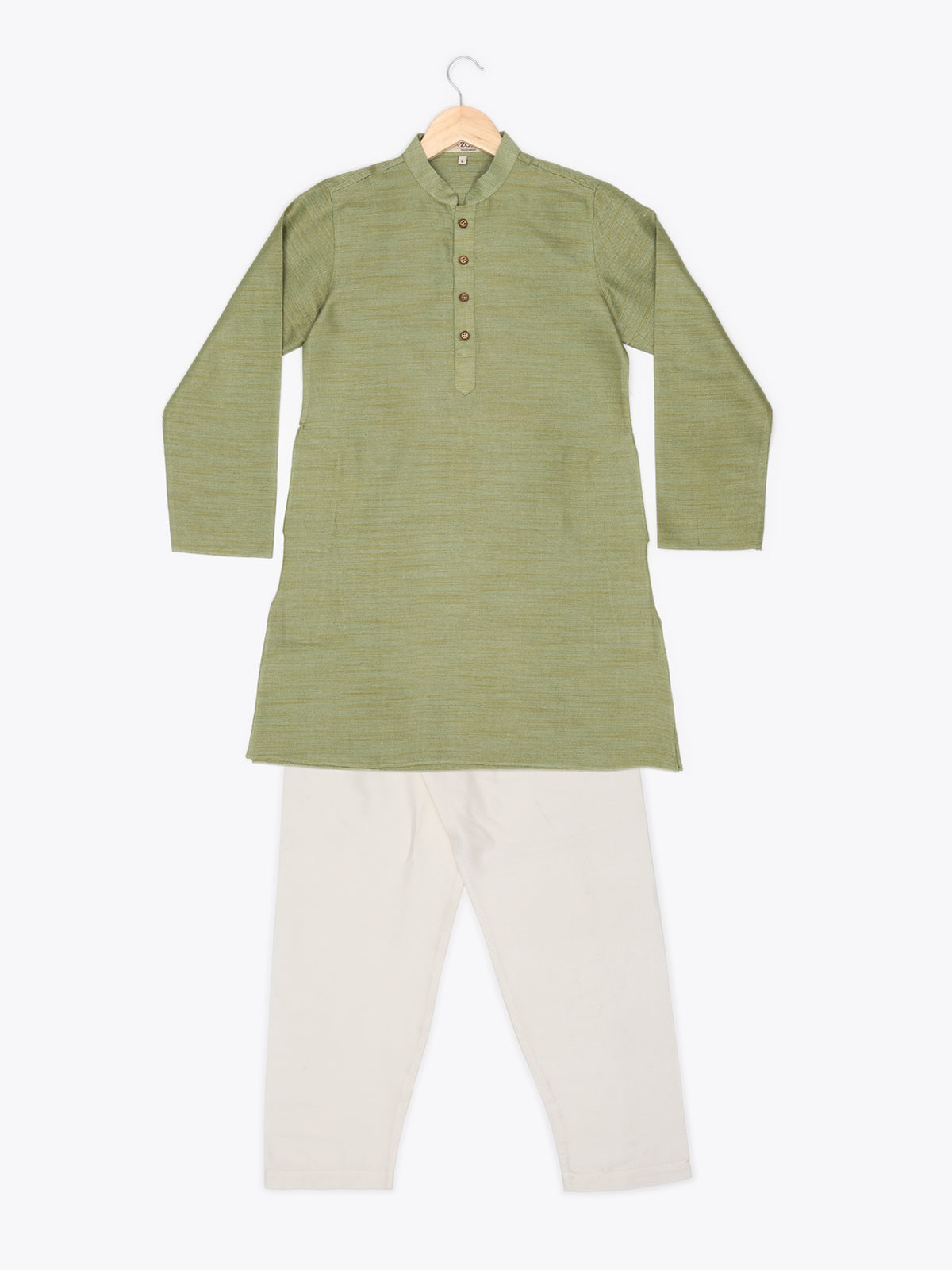 Introducing our meticulously crafted knee-length boys' ethnic wear. Made from Pure Cotton this Beige, White, Green, Gold, Multicolor, Yellow, Brown, Pink, Purple, Blue, Black, Red-colored outfit with a plain weave pattern is perfect for festive and party occasions. The Mandarin collared neck adds an authentic touch, while our commitment to simplicity and elegance is reflected in its straight shape. With a unique fusion of tradition and contemporary design, this Self Design kurta exemplifies ZOIS' dedication to high-quality traditional wear.