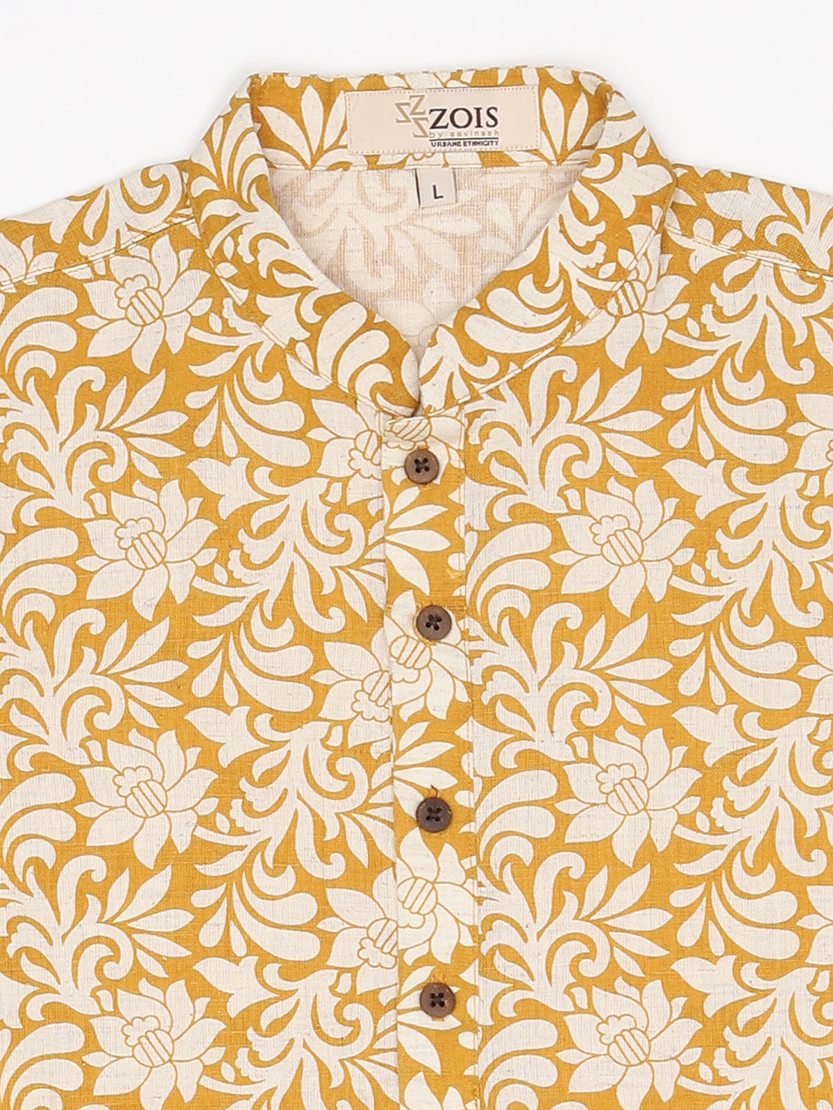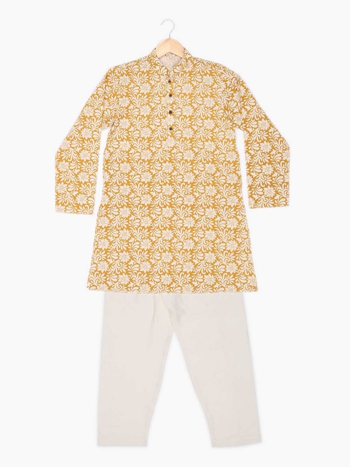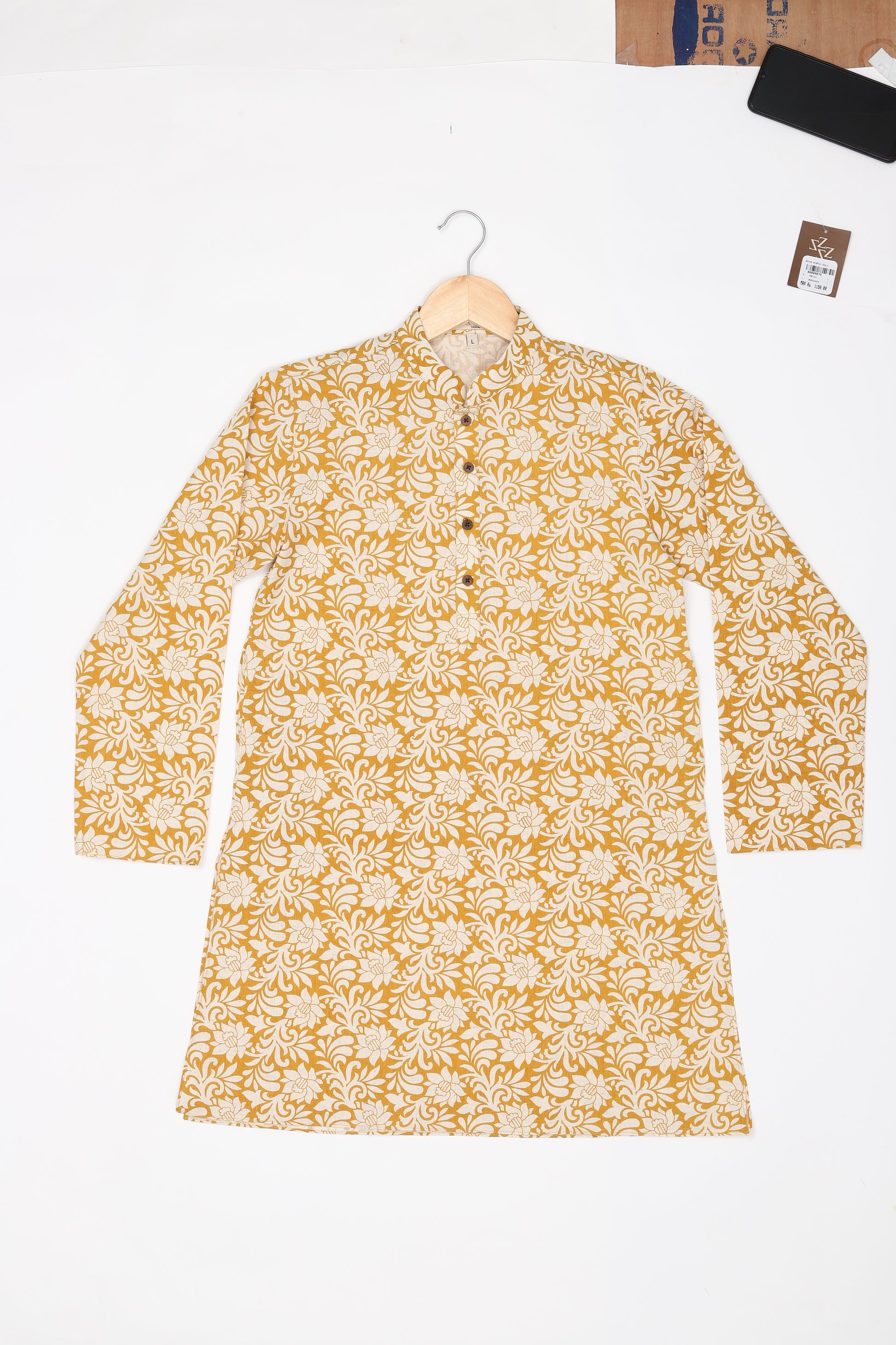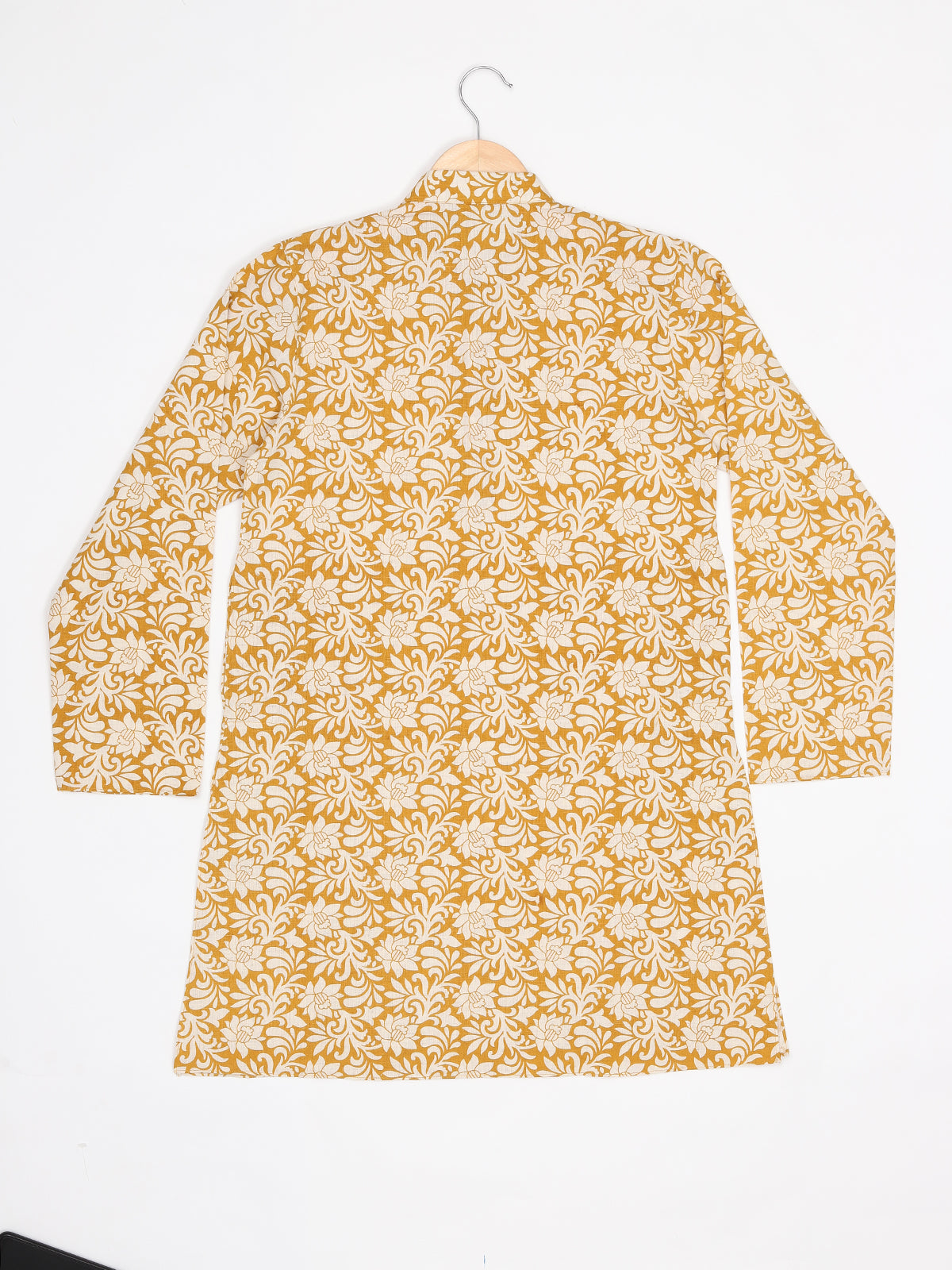 Introducing our meticulously crafted knee-length boys' ethnic wear. Made from Pure Cotton this Gold-colored outfit with a plain weave pattern is perfect for festive and party occasions. The Mandarin collared neck adds an authentic touch, while our commitment to simplicity and elegance is reflected in its straight shape. With a unique fusion of tradition and contemporary design, this Self Design kurta exemplifies ZOIS' dedication to high-quality traditional wear.