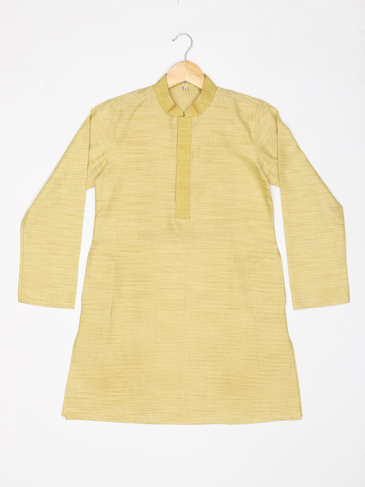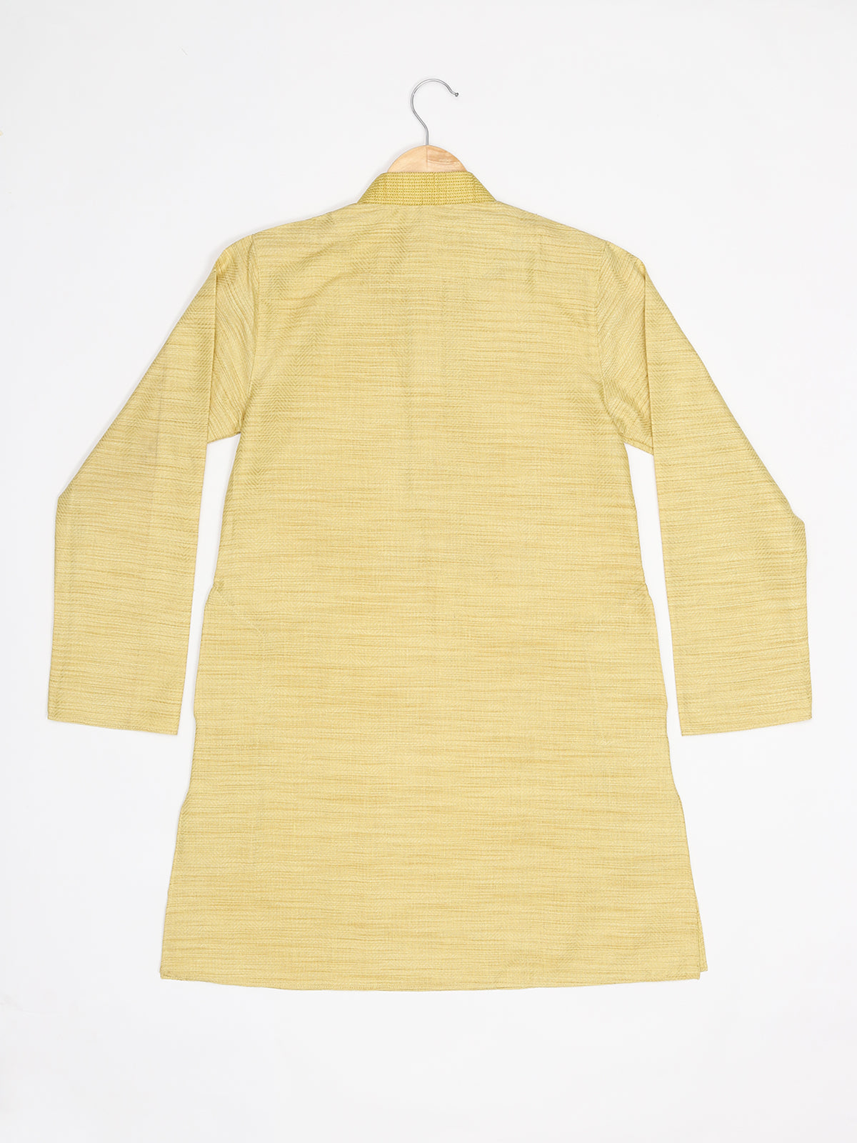 Introducing our meticulously crafted knee-length boys' ethnic wear. Made from Pure Cotton this Yellow-colored outfit with a plain weave pattern is perfect for festive and party occasions. The Mandarin collared neck adds an authentic touch, while our commitment to simplicity and elegance is reflected in its straight shape. With a unique fusion of tradition and contemporary design, this Self Design kurta exemplifies ZOIS' dedication to high-quality traditional wear.