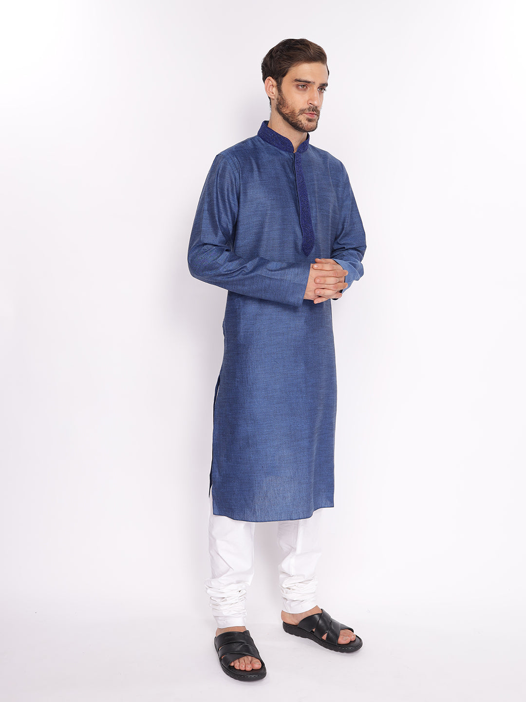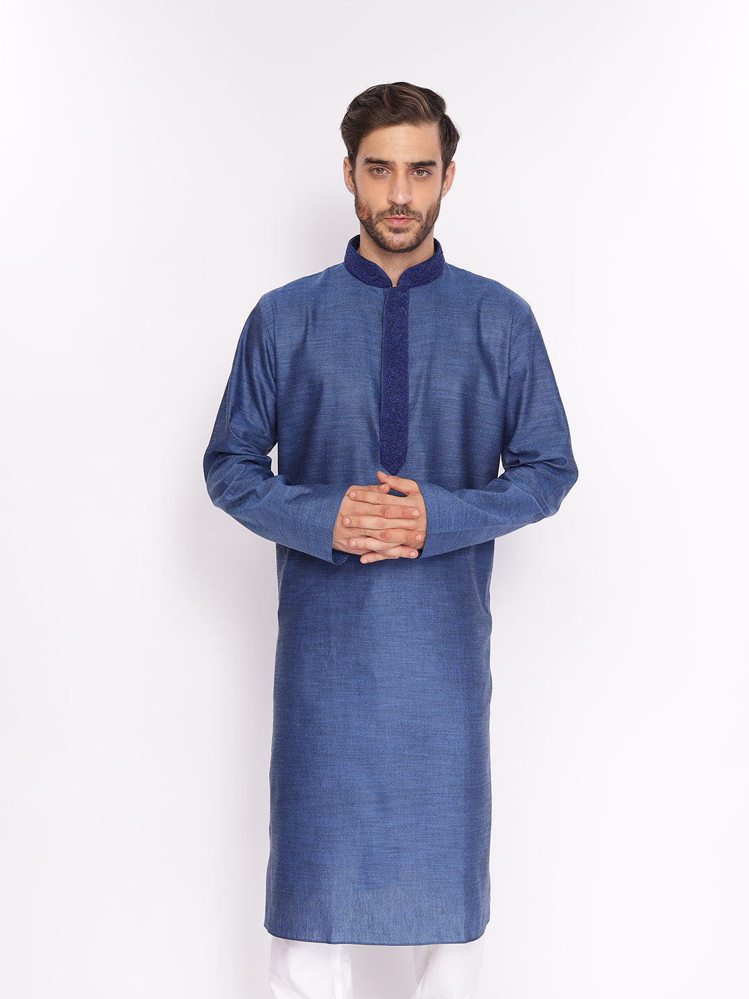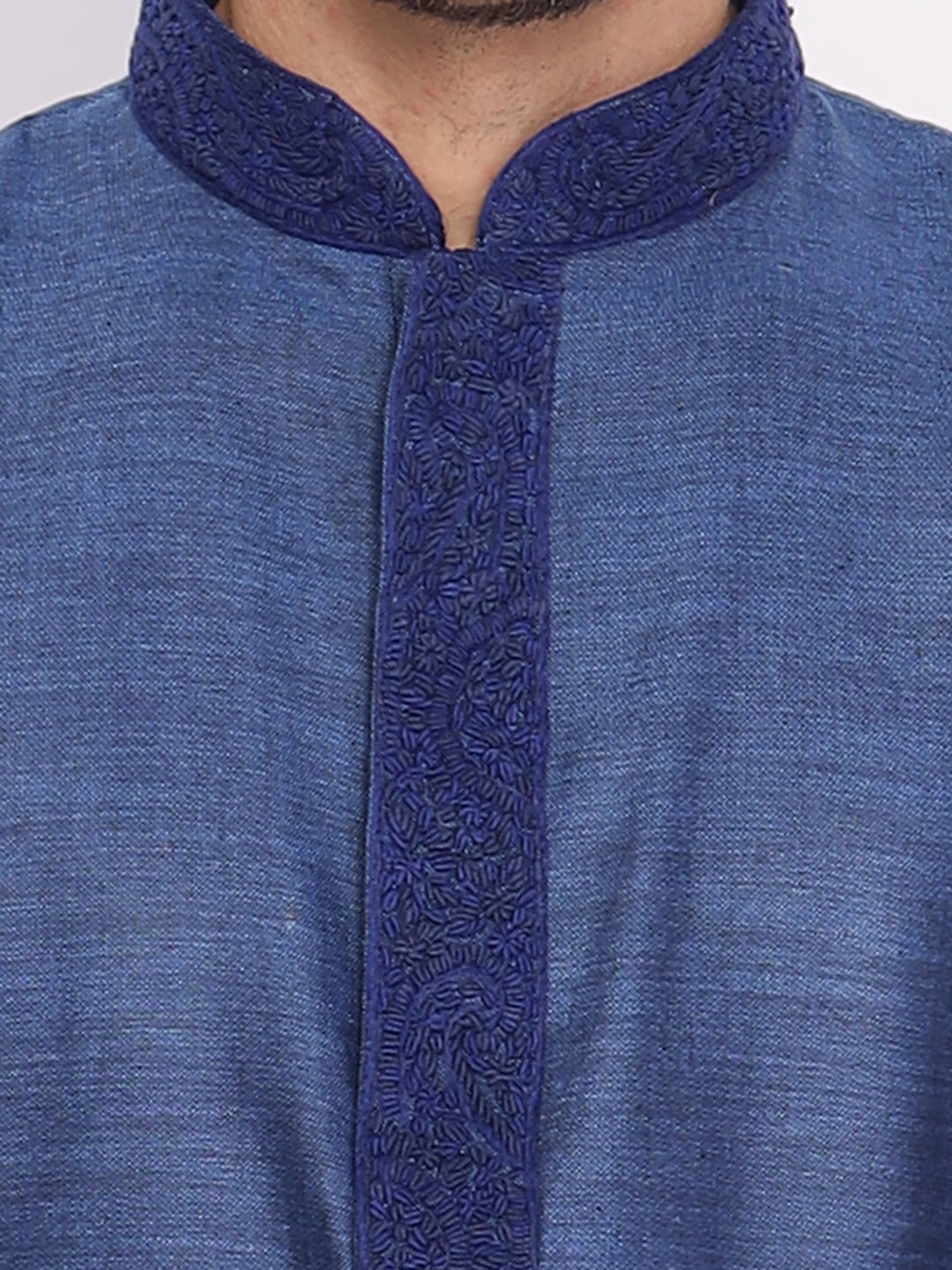 Full Sleeve Embroidered::Solid Kurta and Pyjama Set in Blue::White Cotton Blend