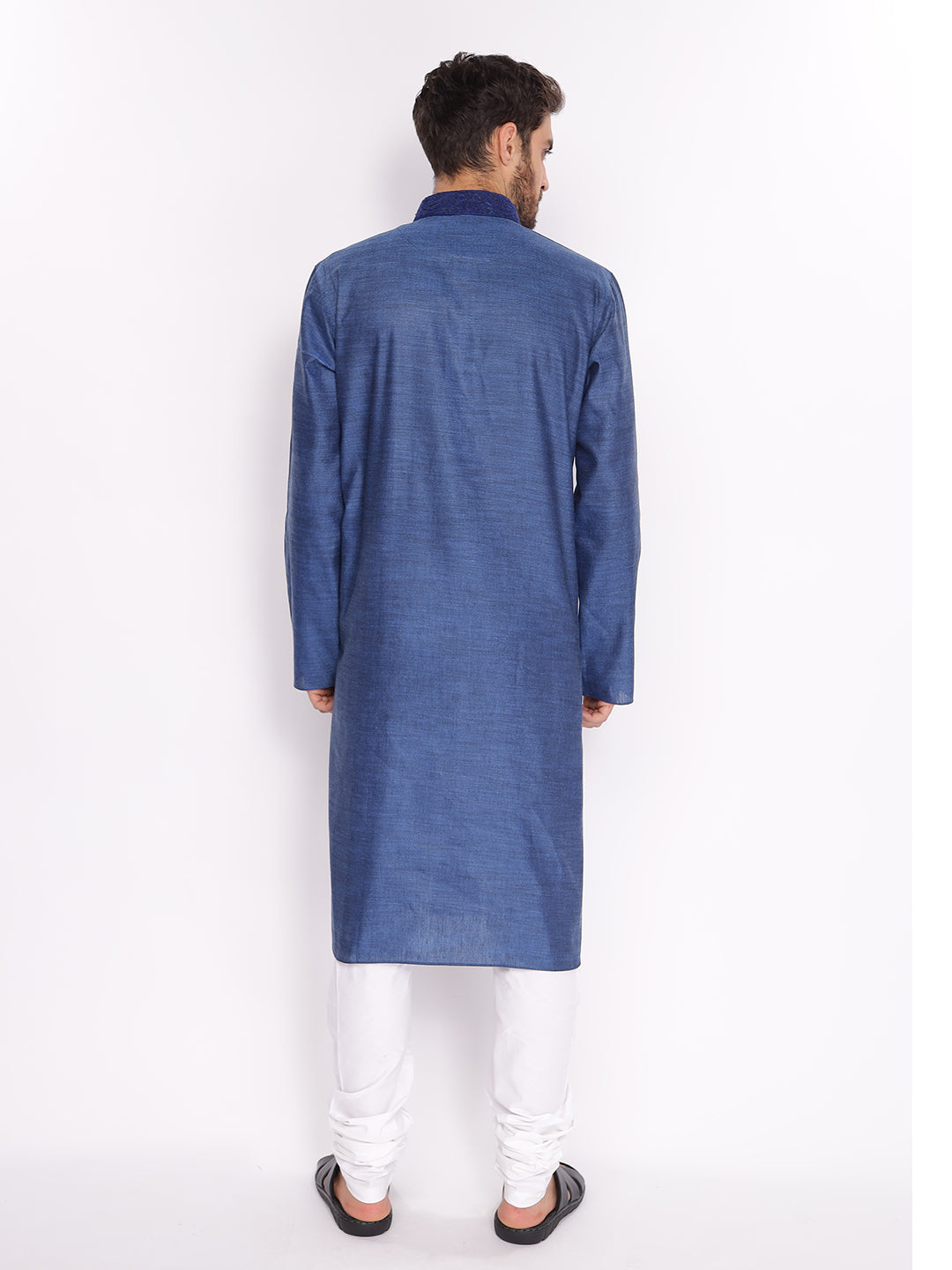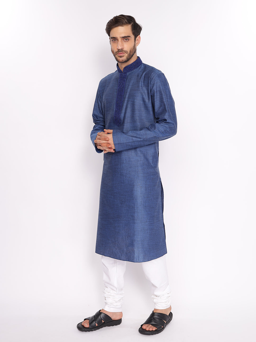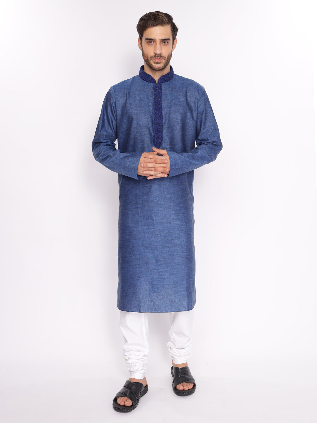 Full Sleeve Embroidered::Solid Kurta and Pyjama Set in Blue::White Cotton Blend