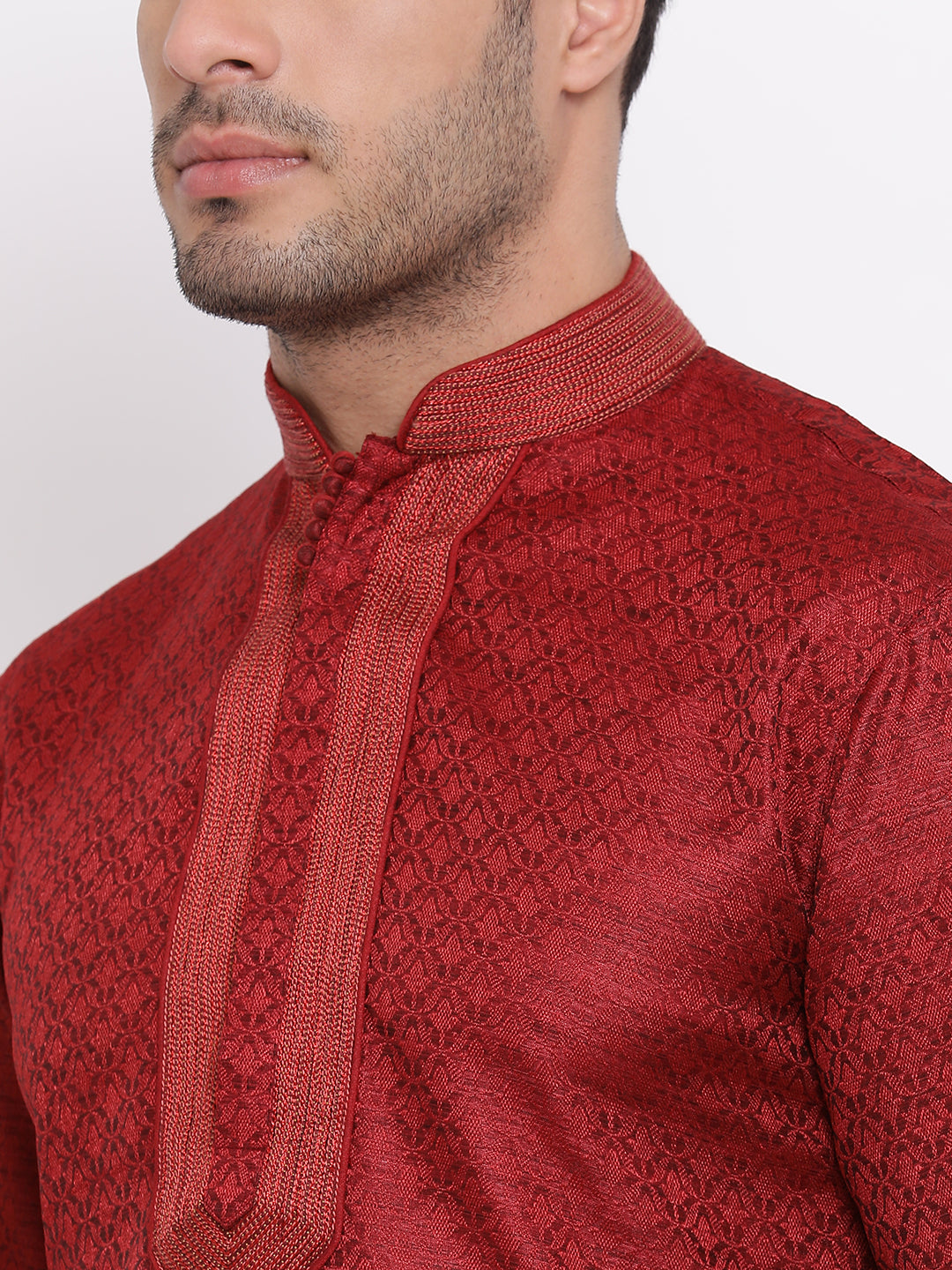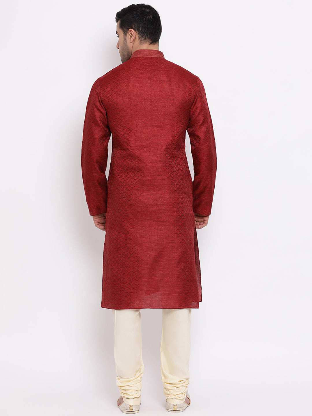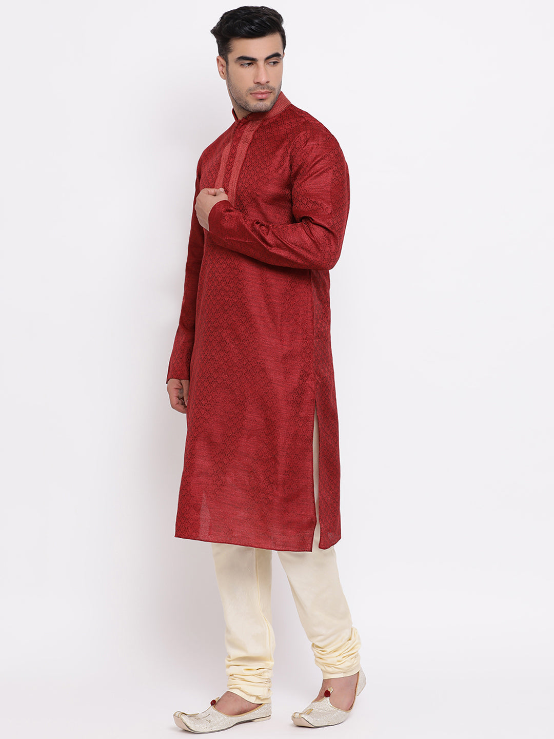 Full Sleeve Printed Kurta and Churidar Set in Maroon Jacquard