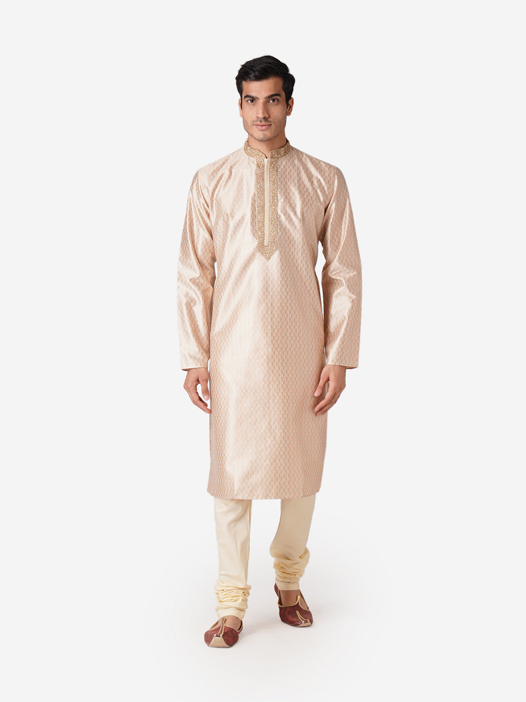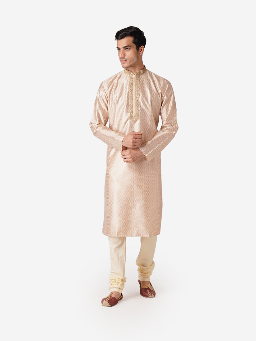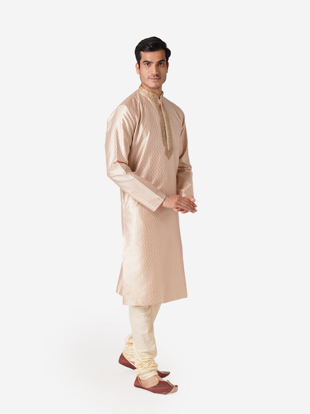 Full Sleeve Self Design Kurta and Churidar Set in Beige Silk Blend