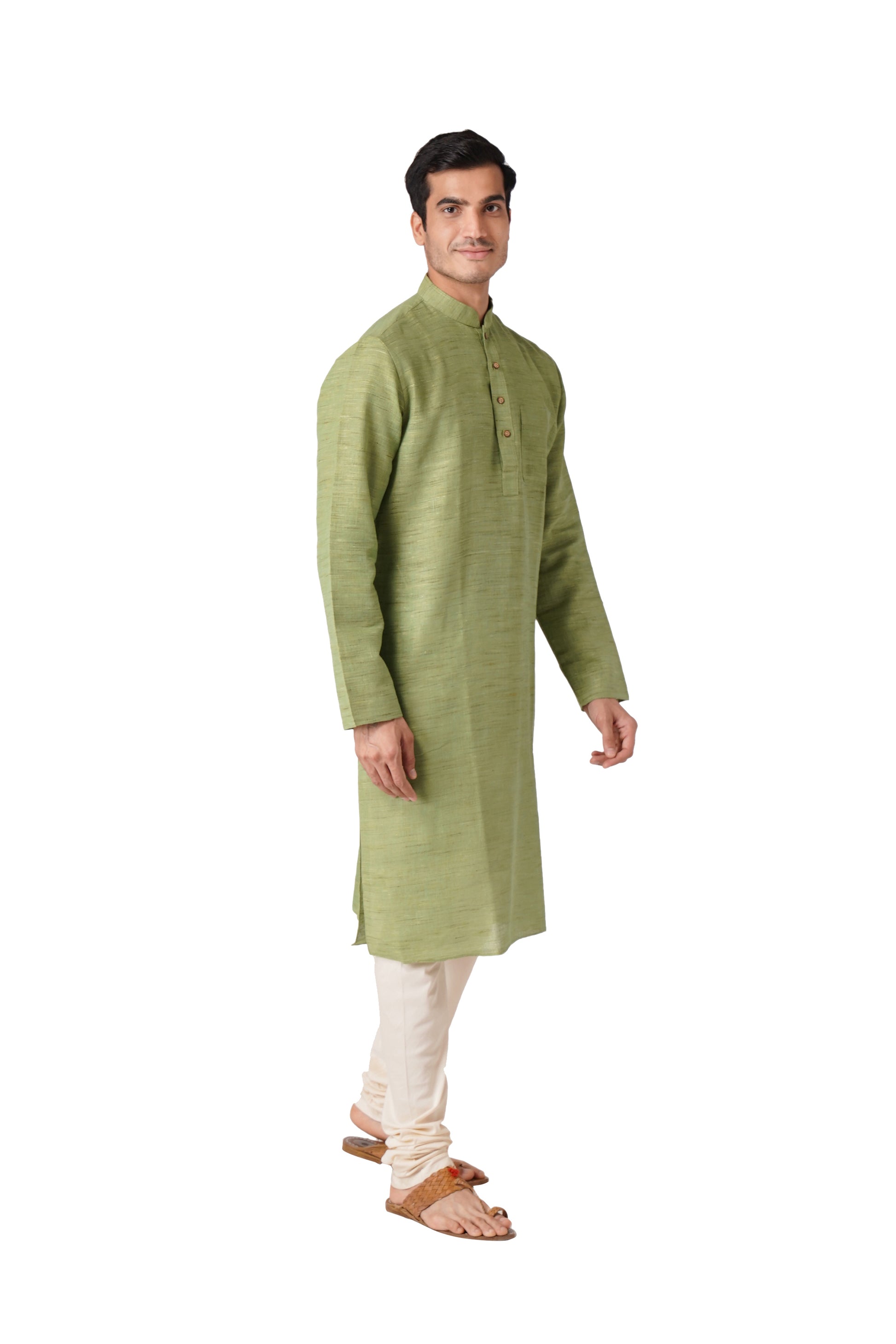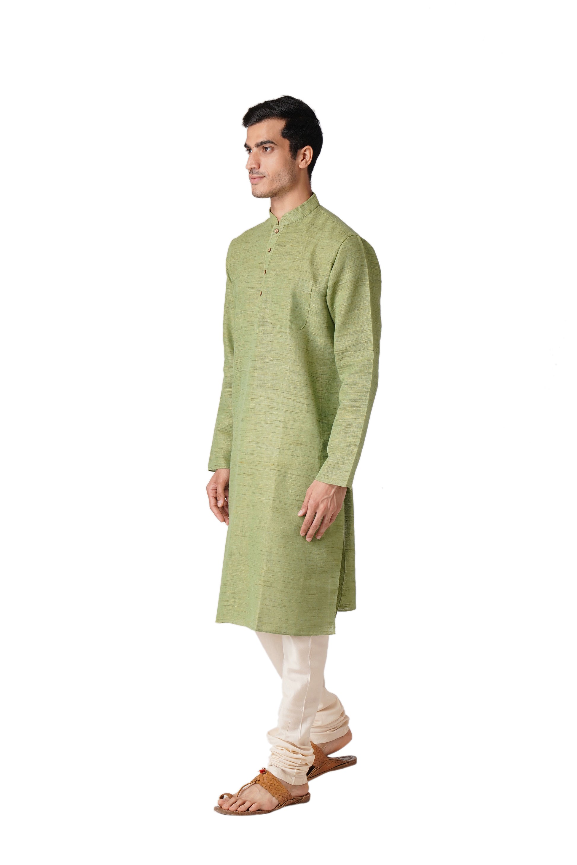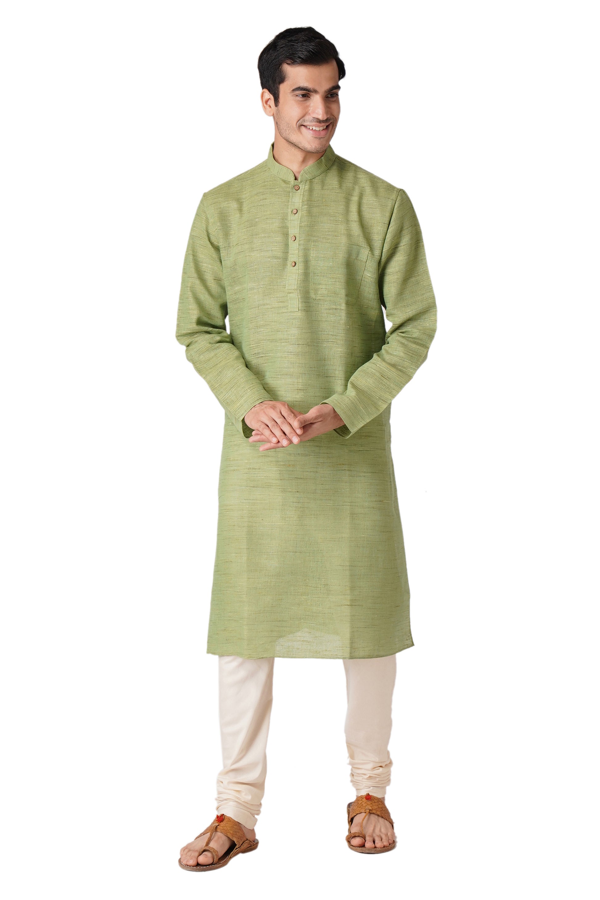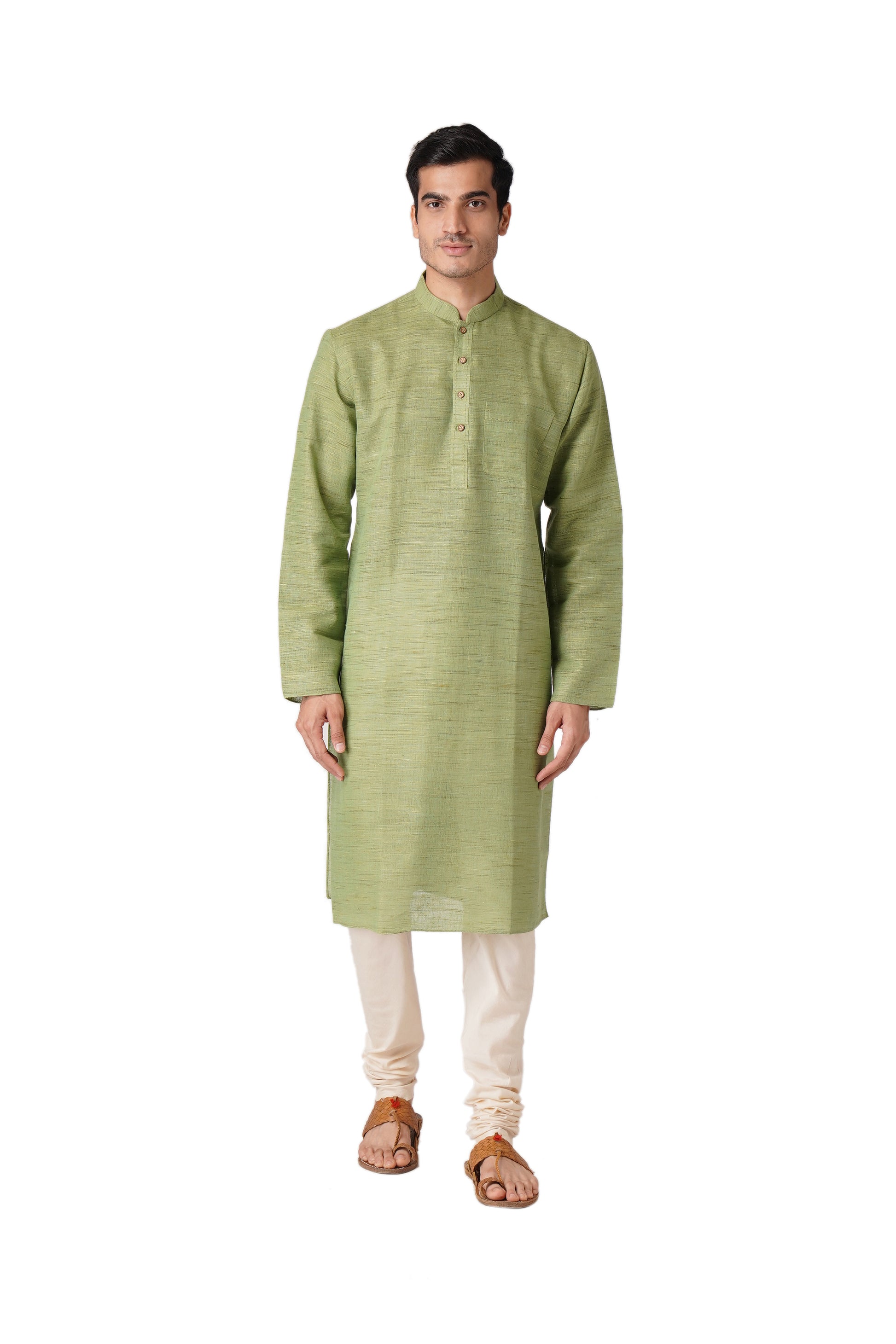 Full Sleeve Self Design Kurta and Churidar Set in Green Khadi Cotton