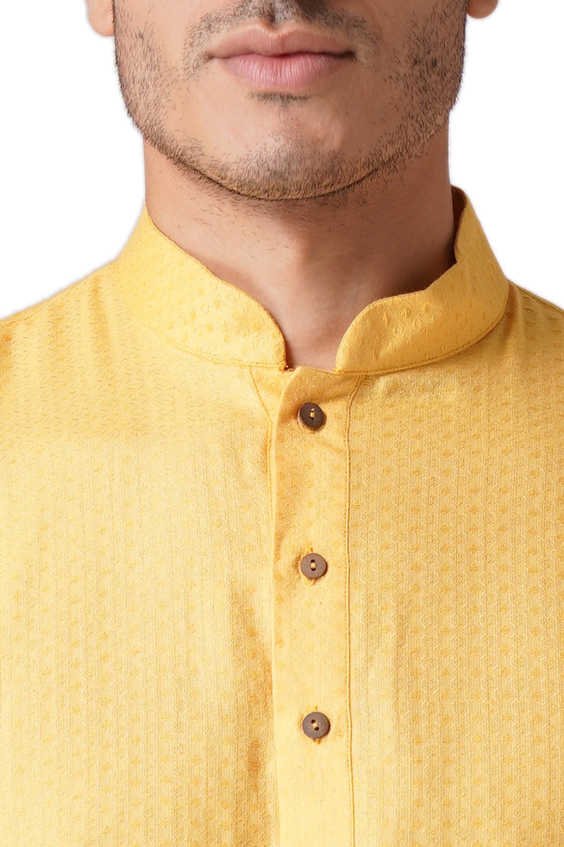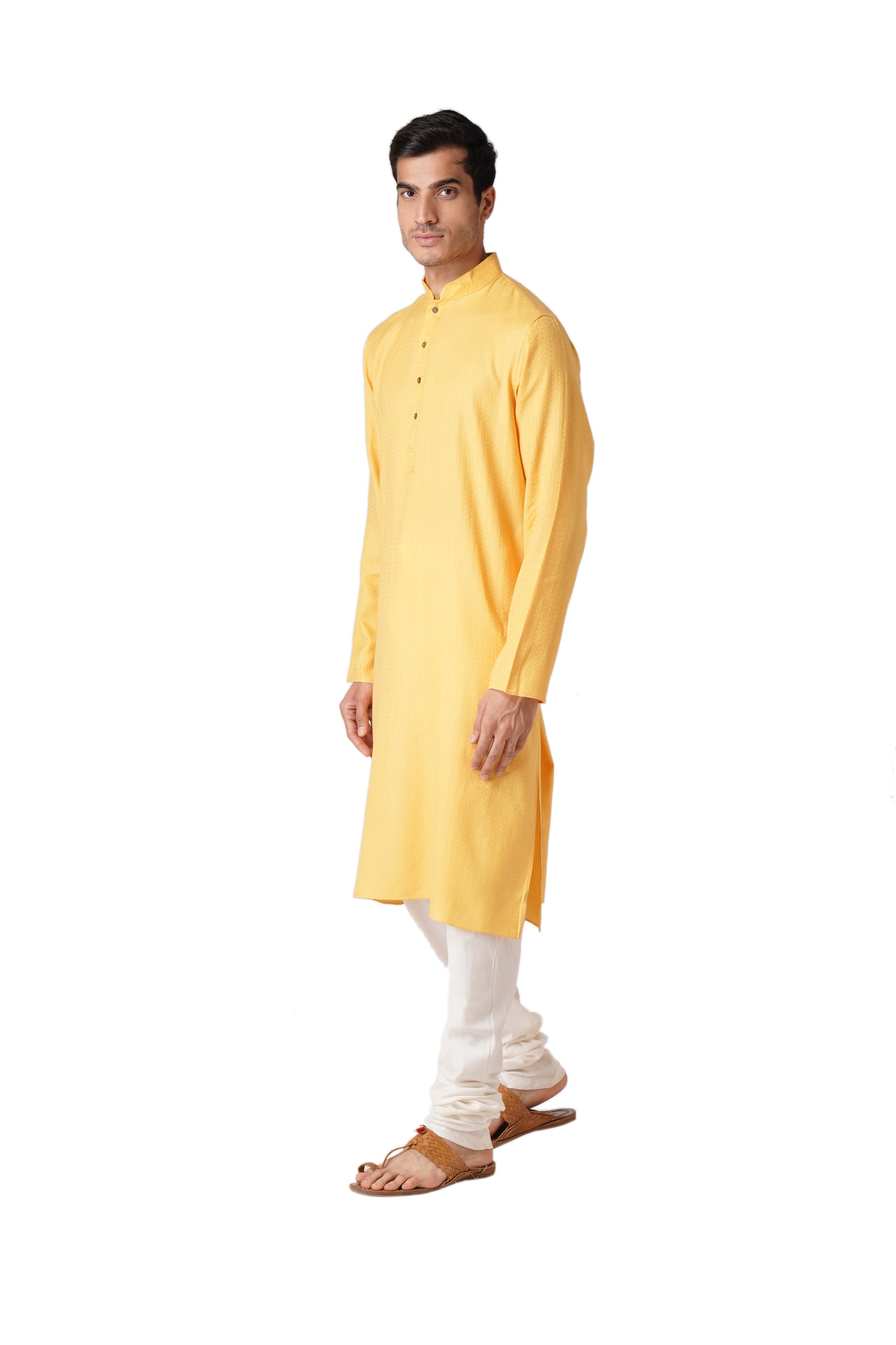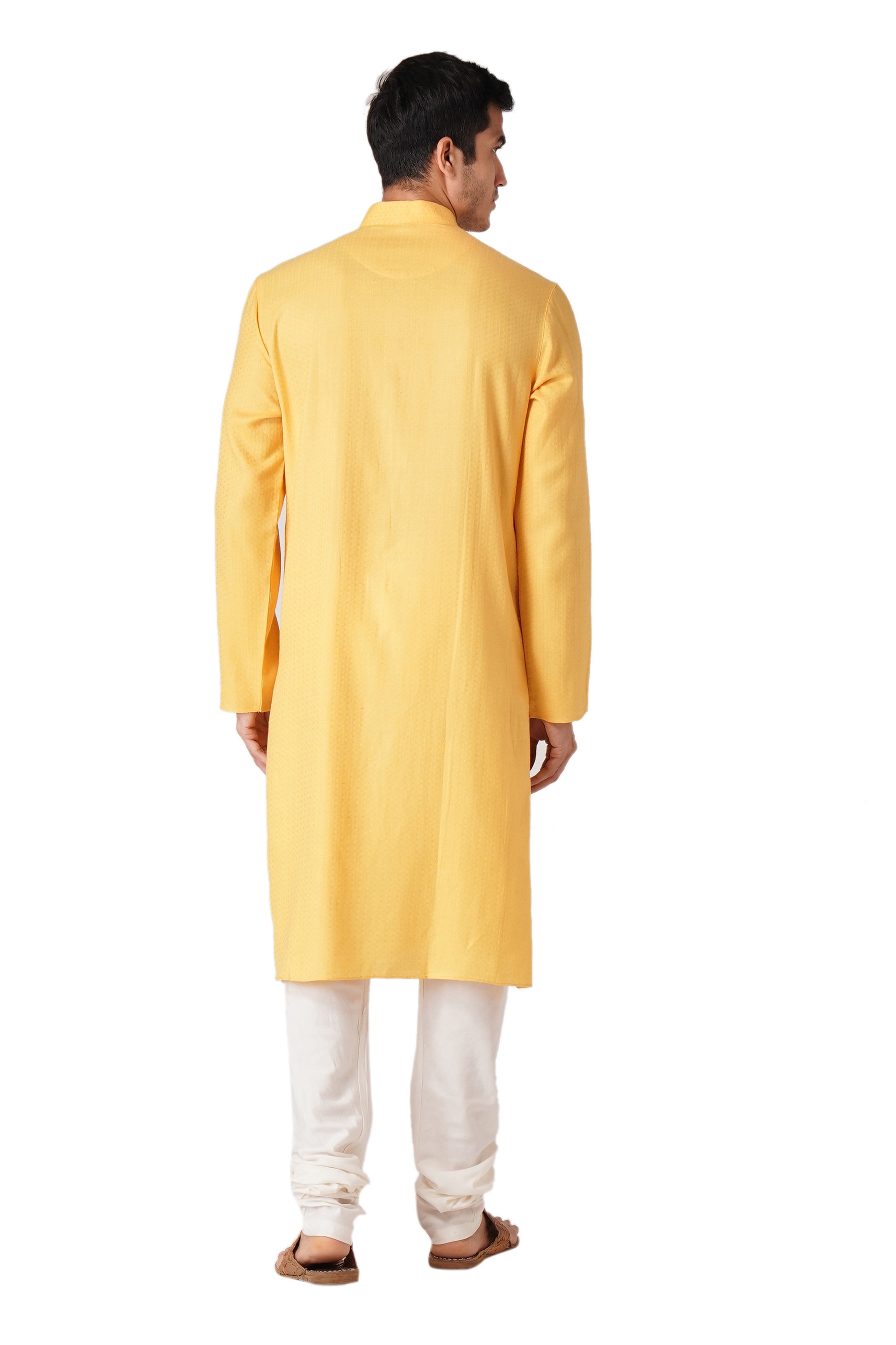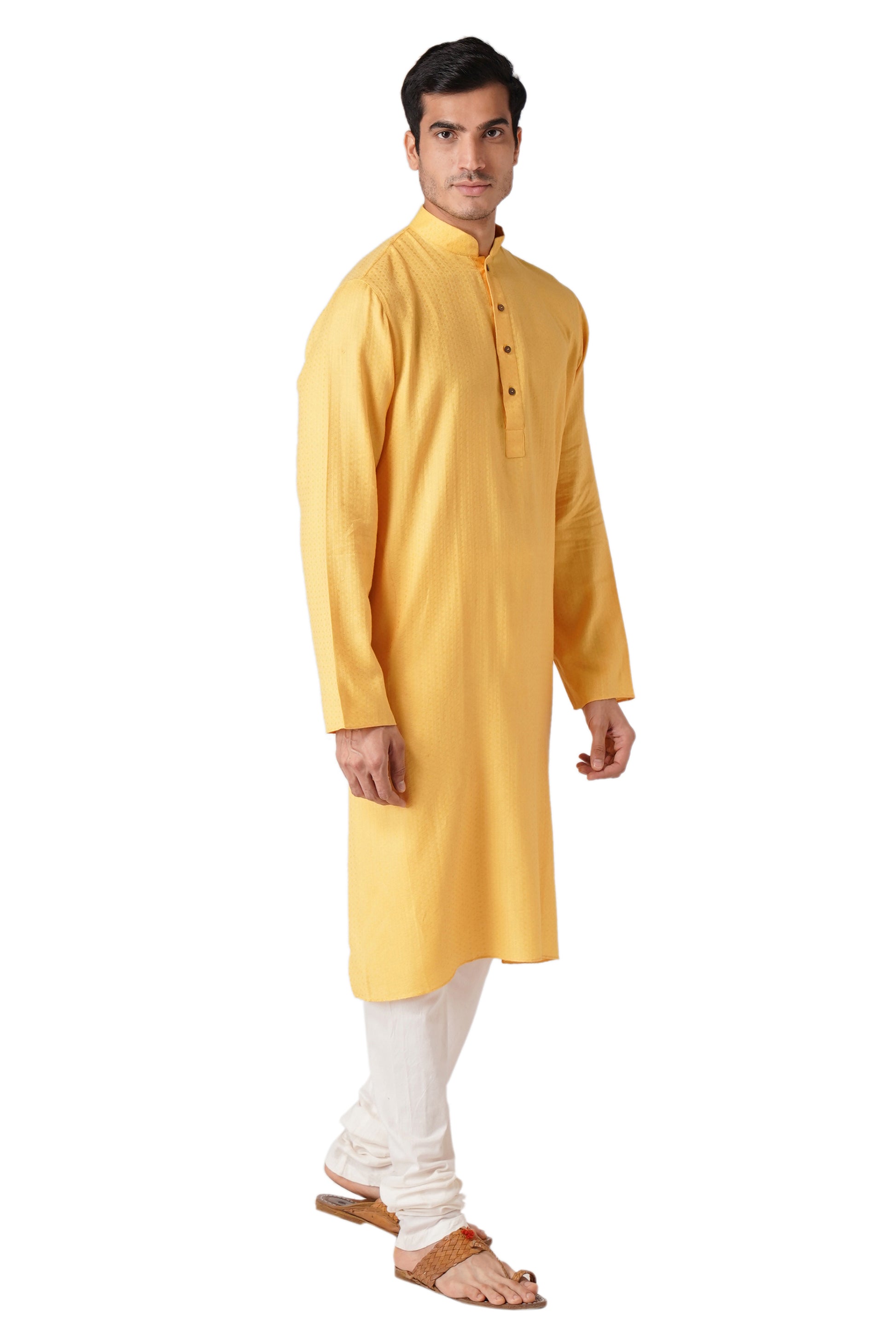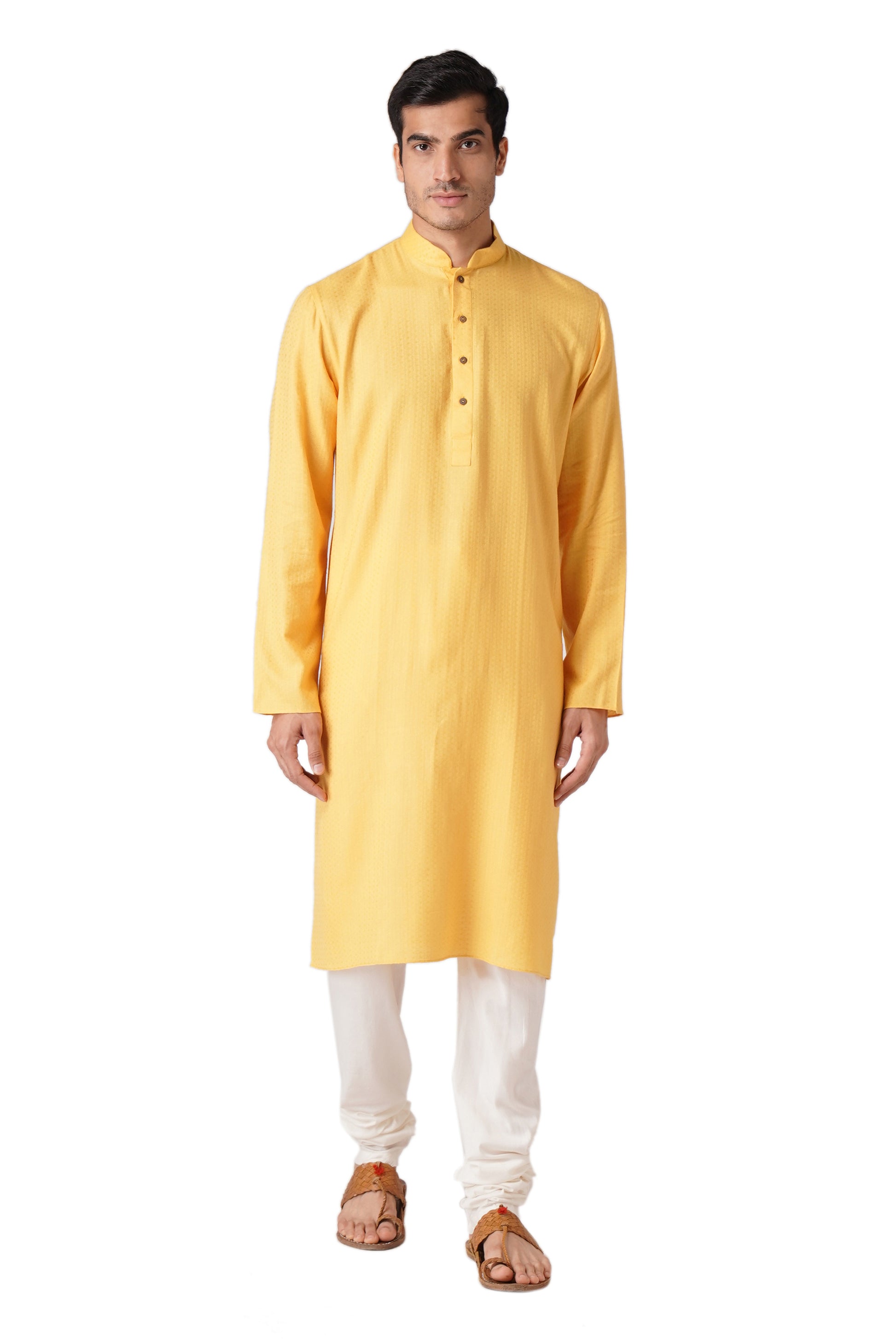 Full Sleeve Self Design Kurta and Churidar Set in Yellow Pure Cotton