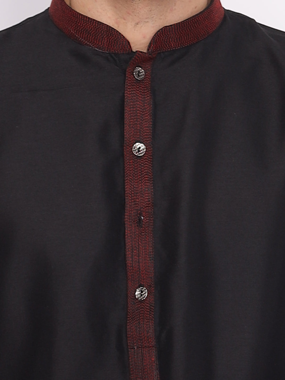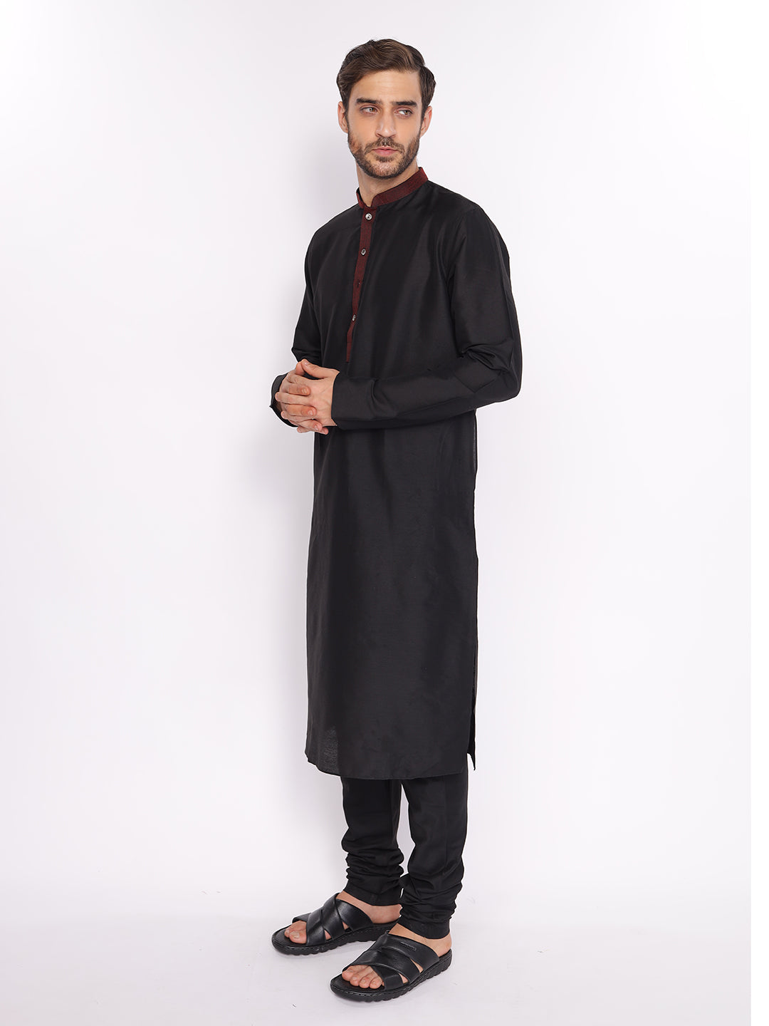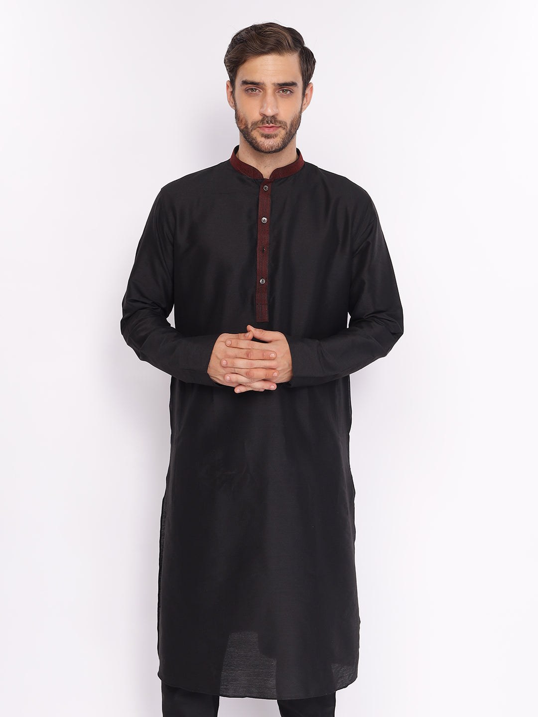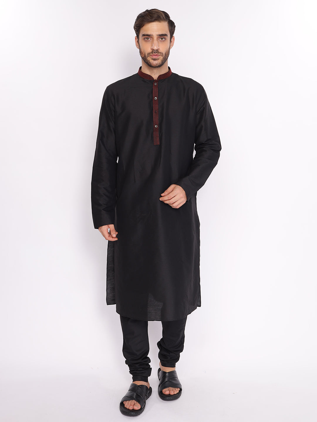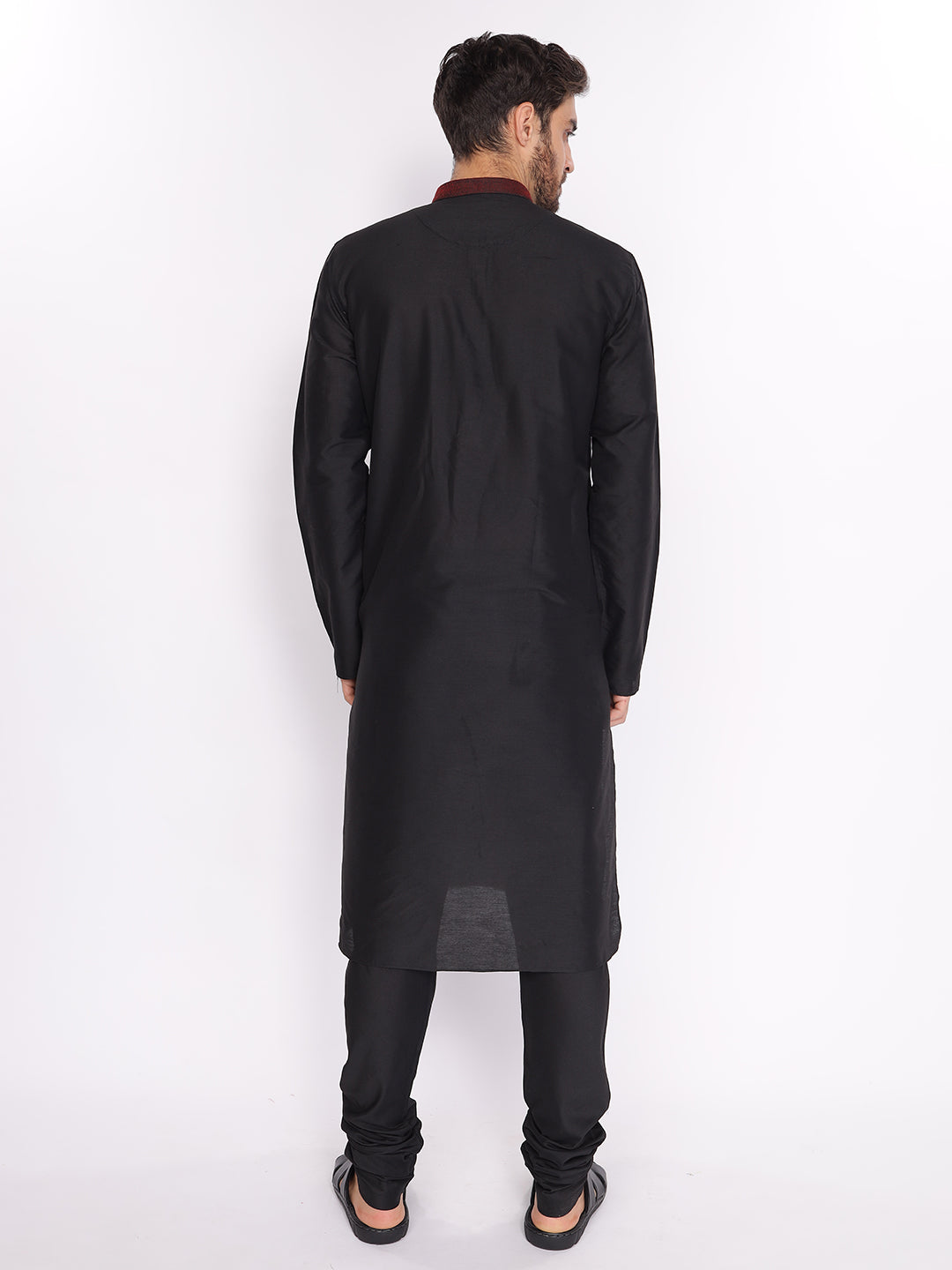 Full Sleeve Self Design Kurta and Pyjama Set in Black Cotton Blend