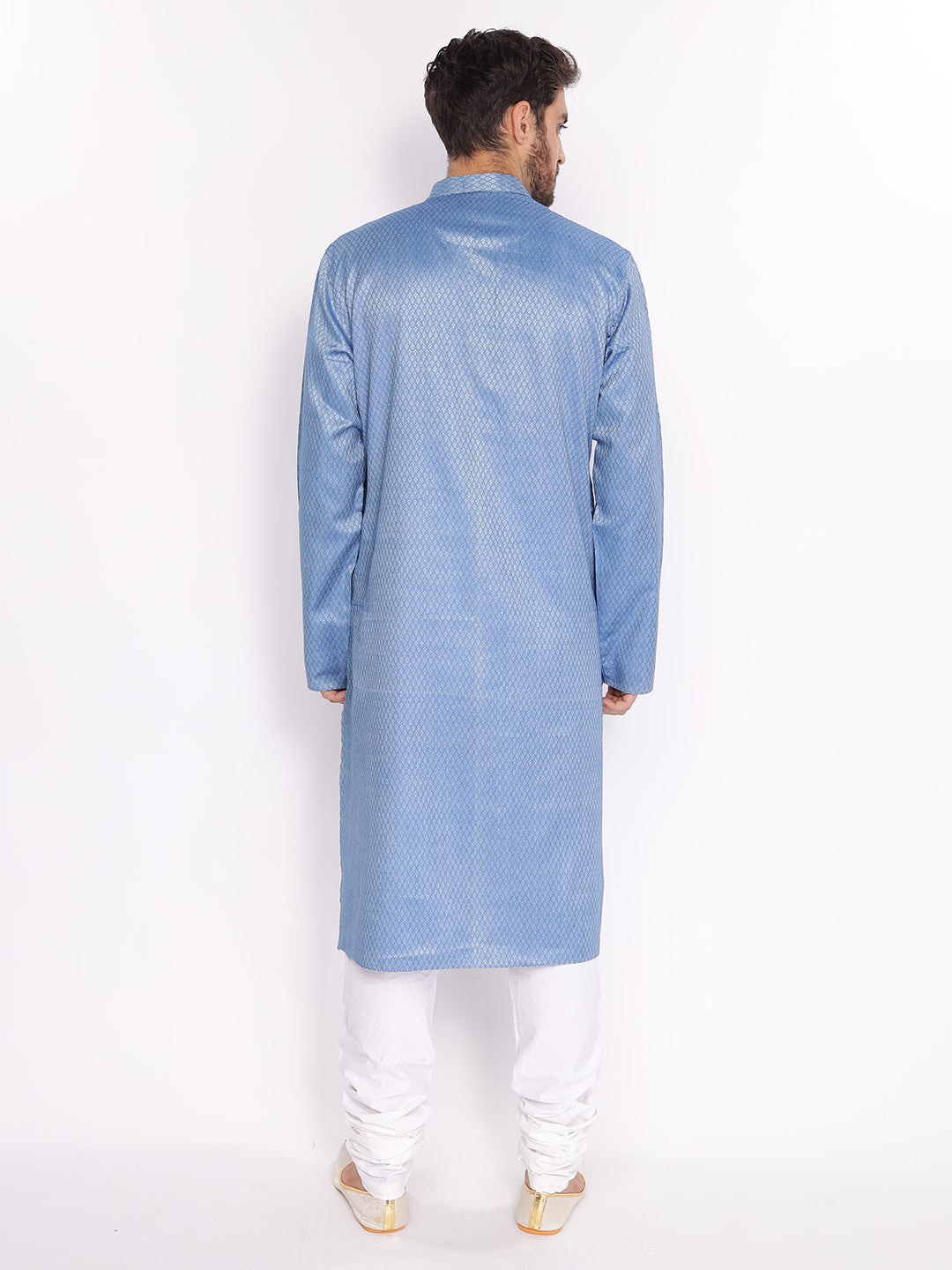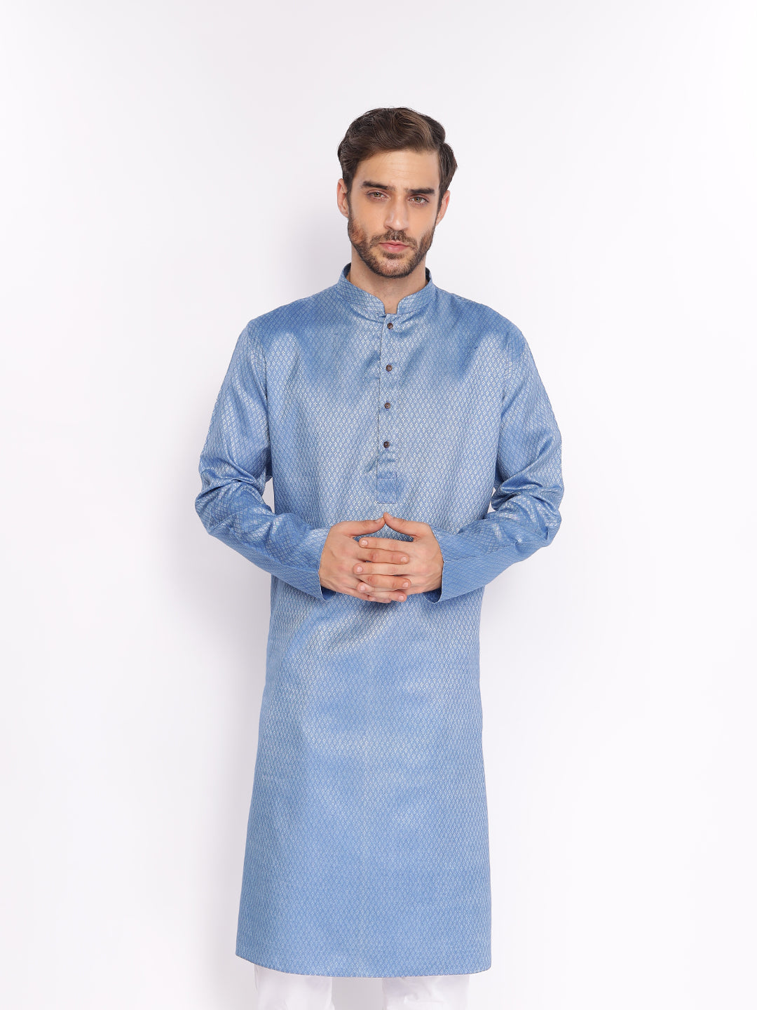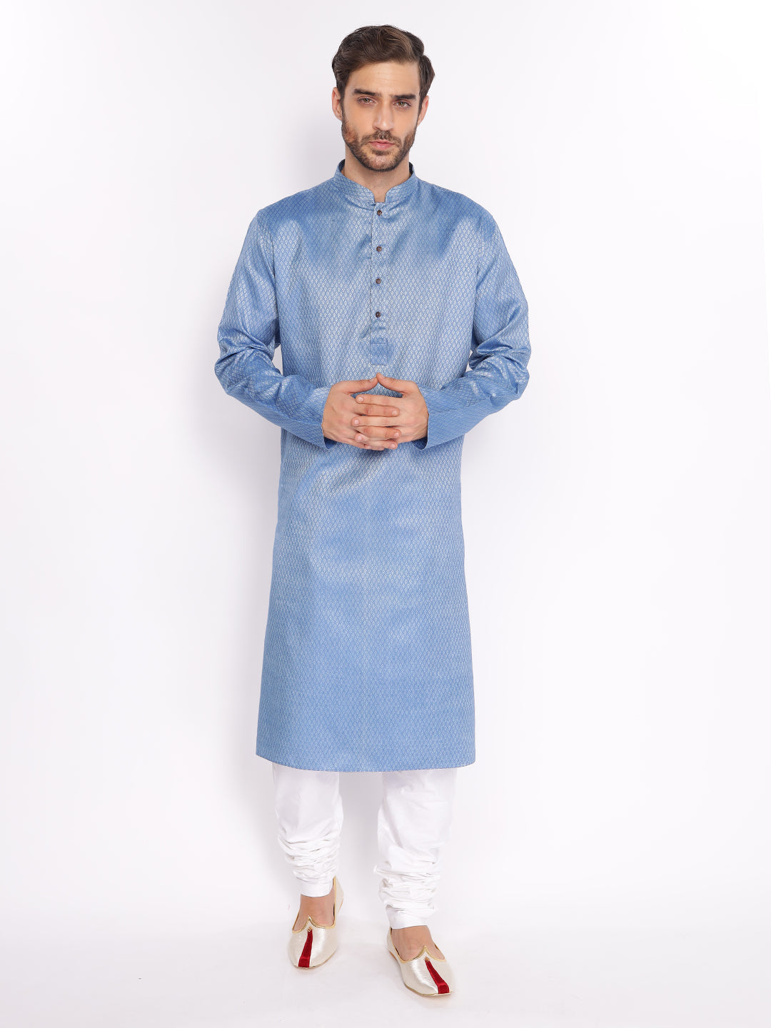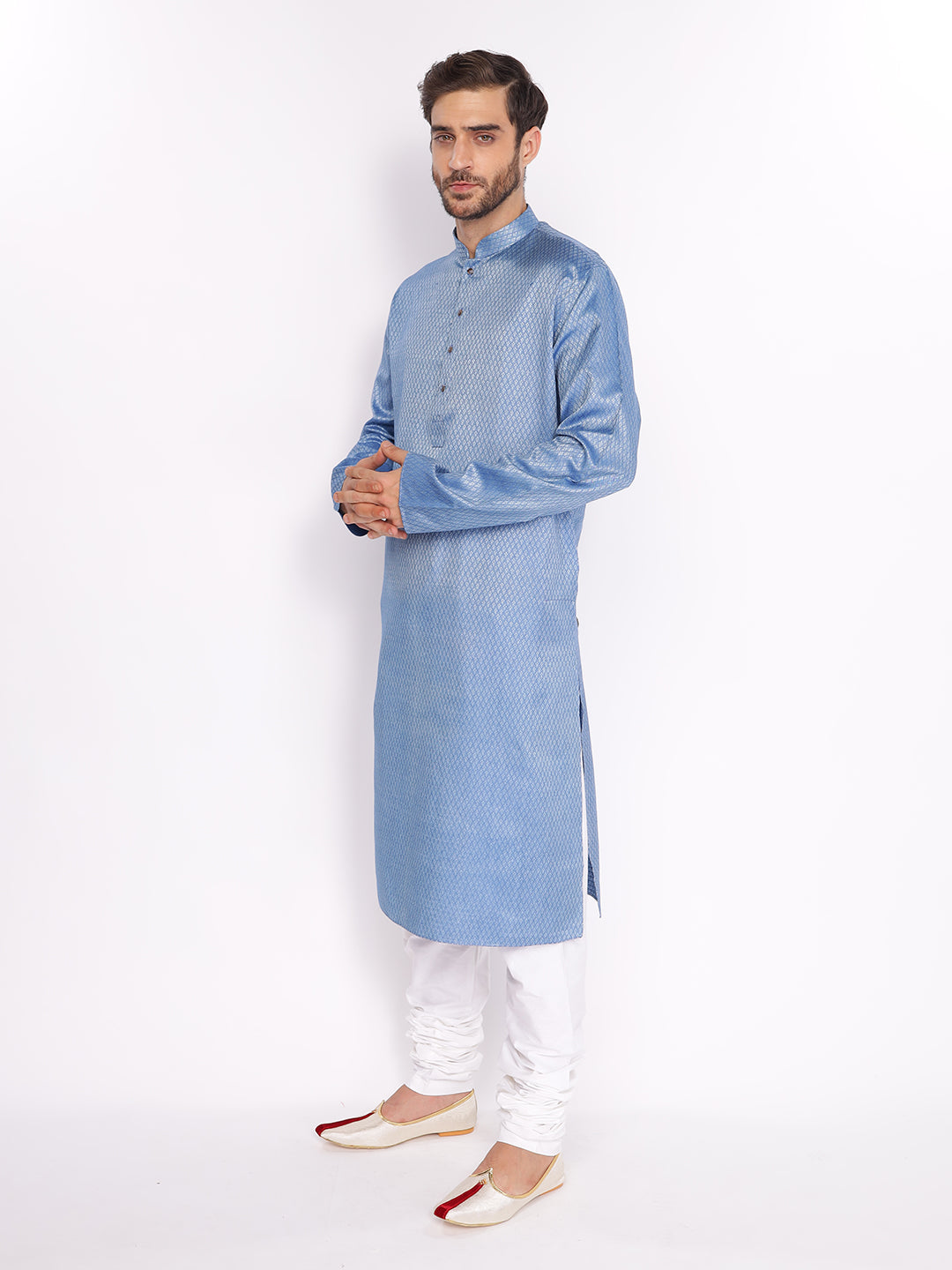 Full Sleeve Self Design Kurta and Pyjama Set in Blue Cotton Blend