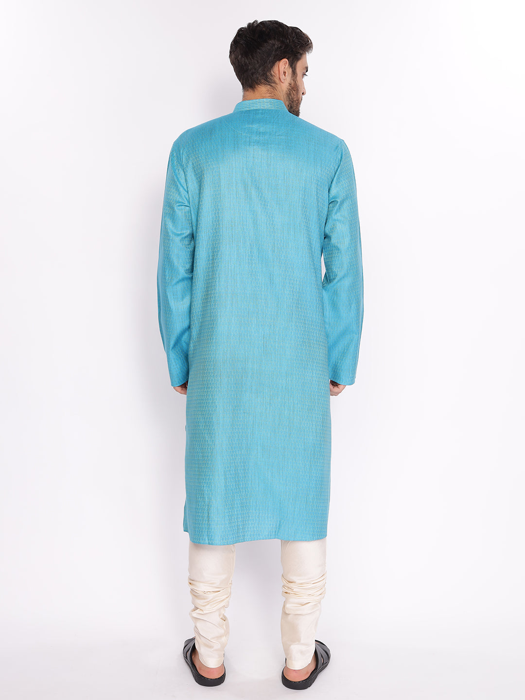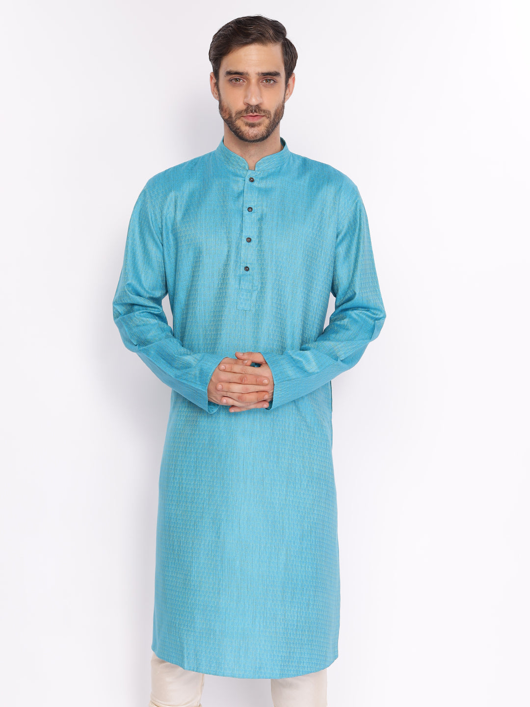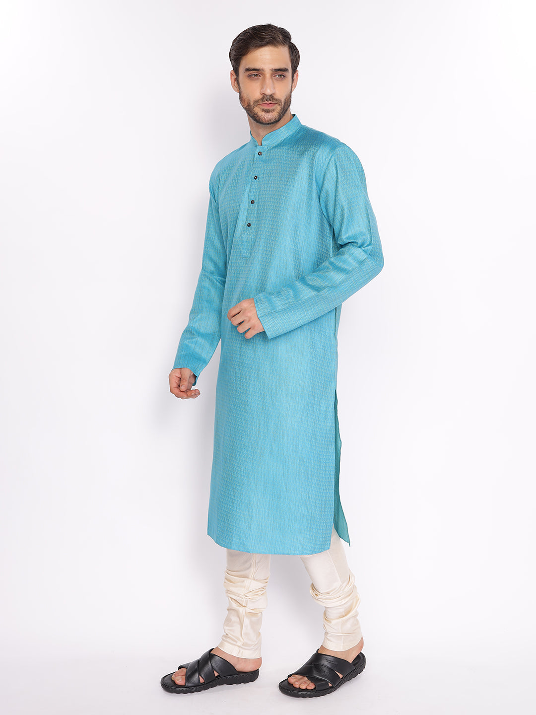 Full Sleeve Self Design Kurta and Pyjama Set in Blue Cotton Blend