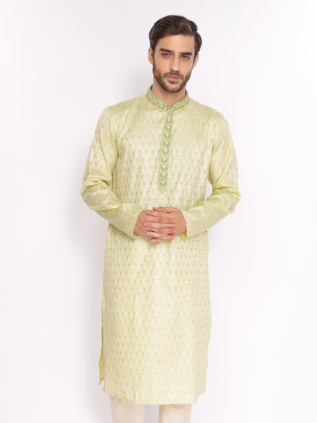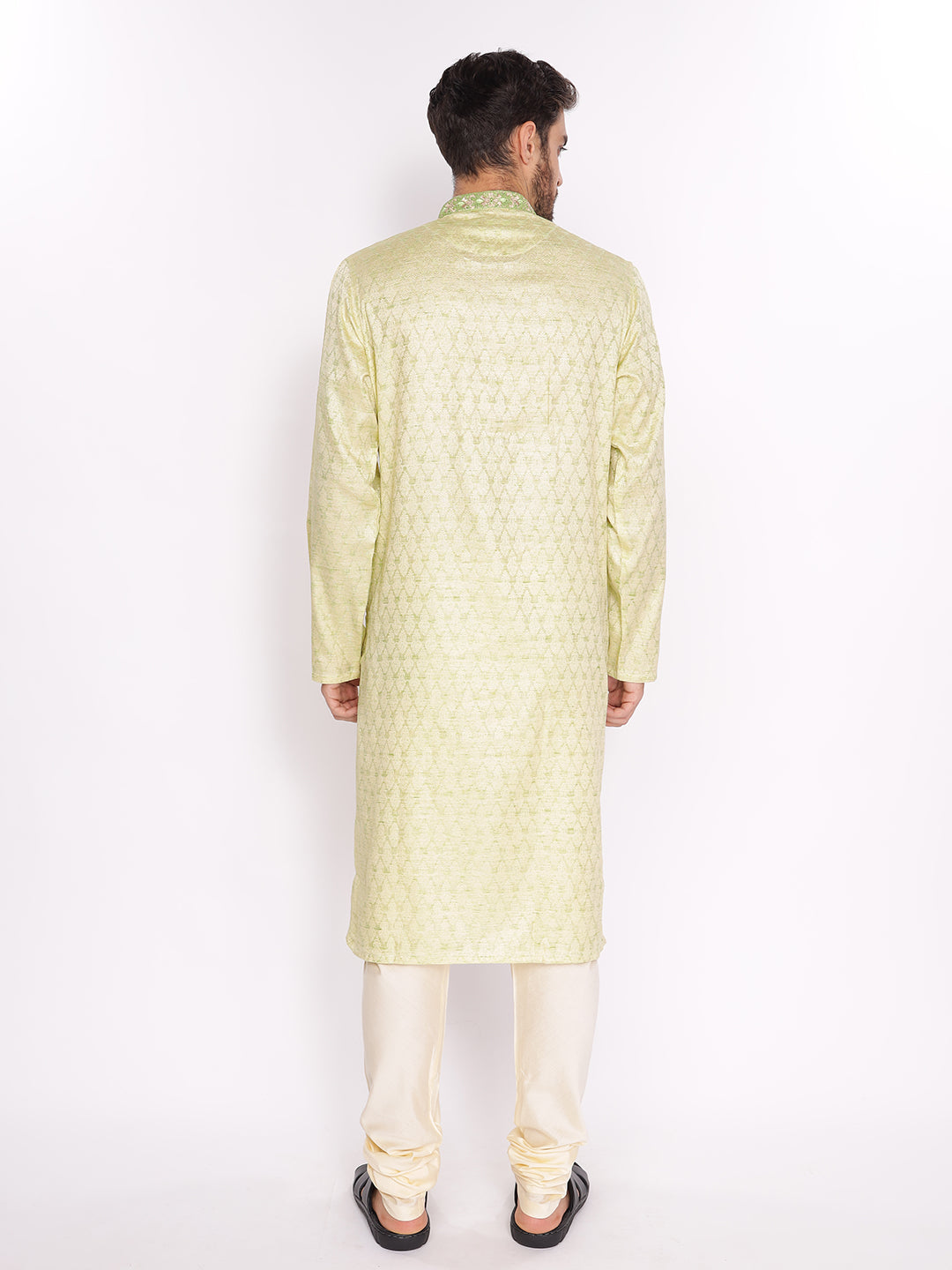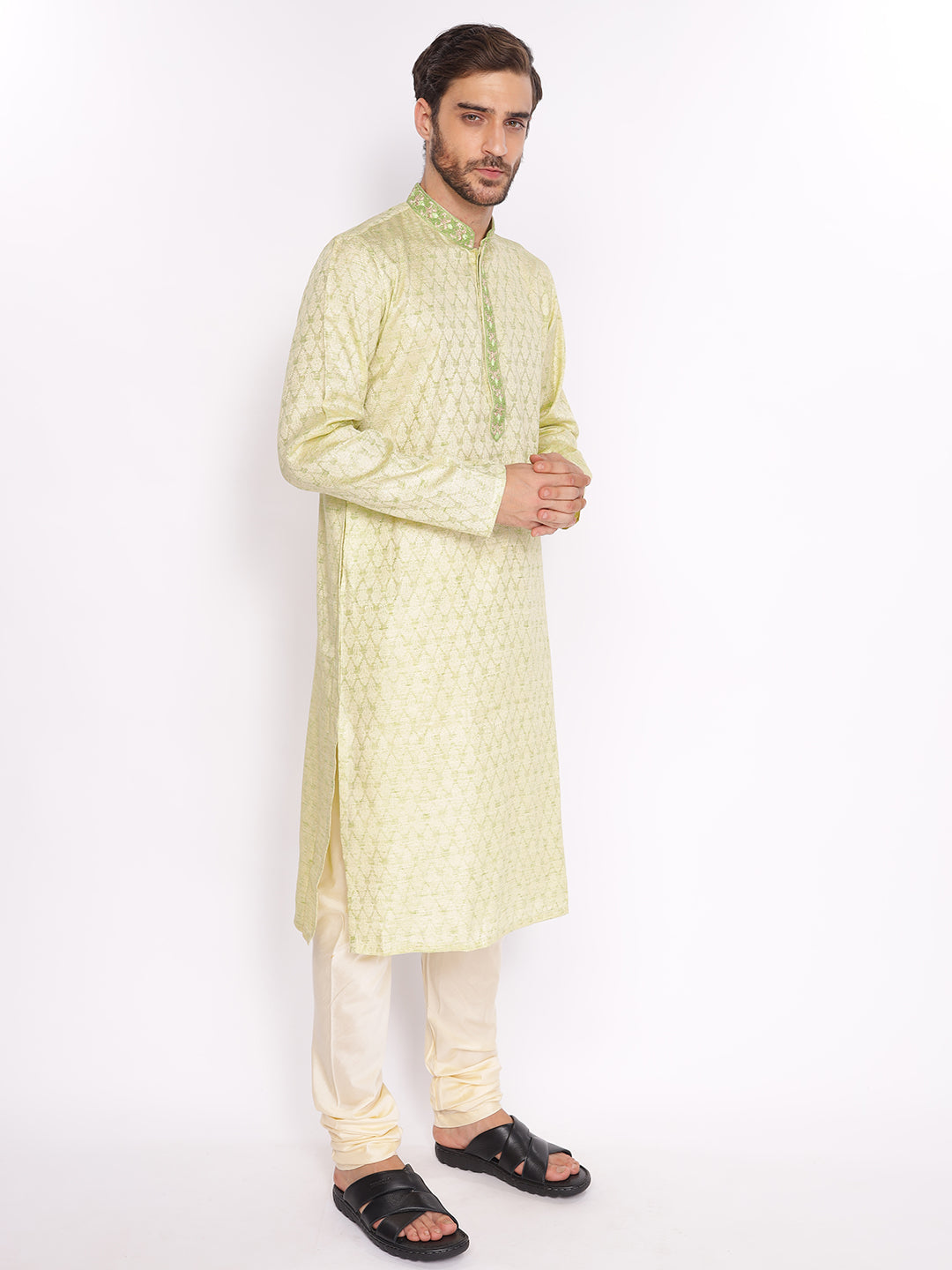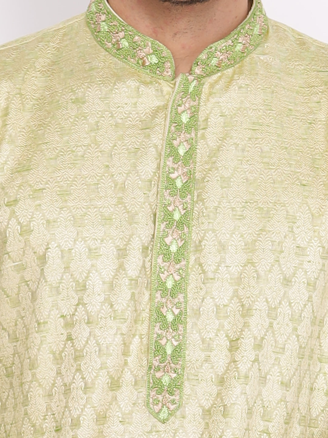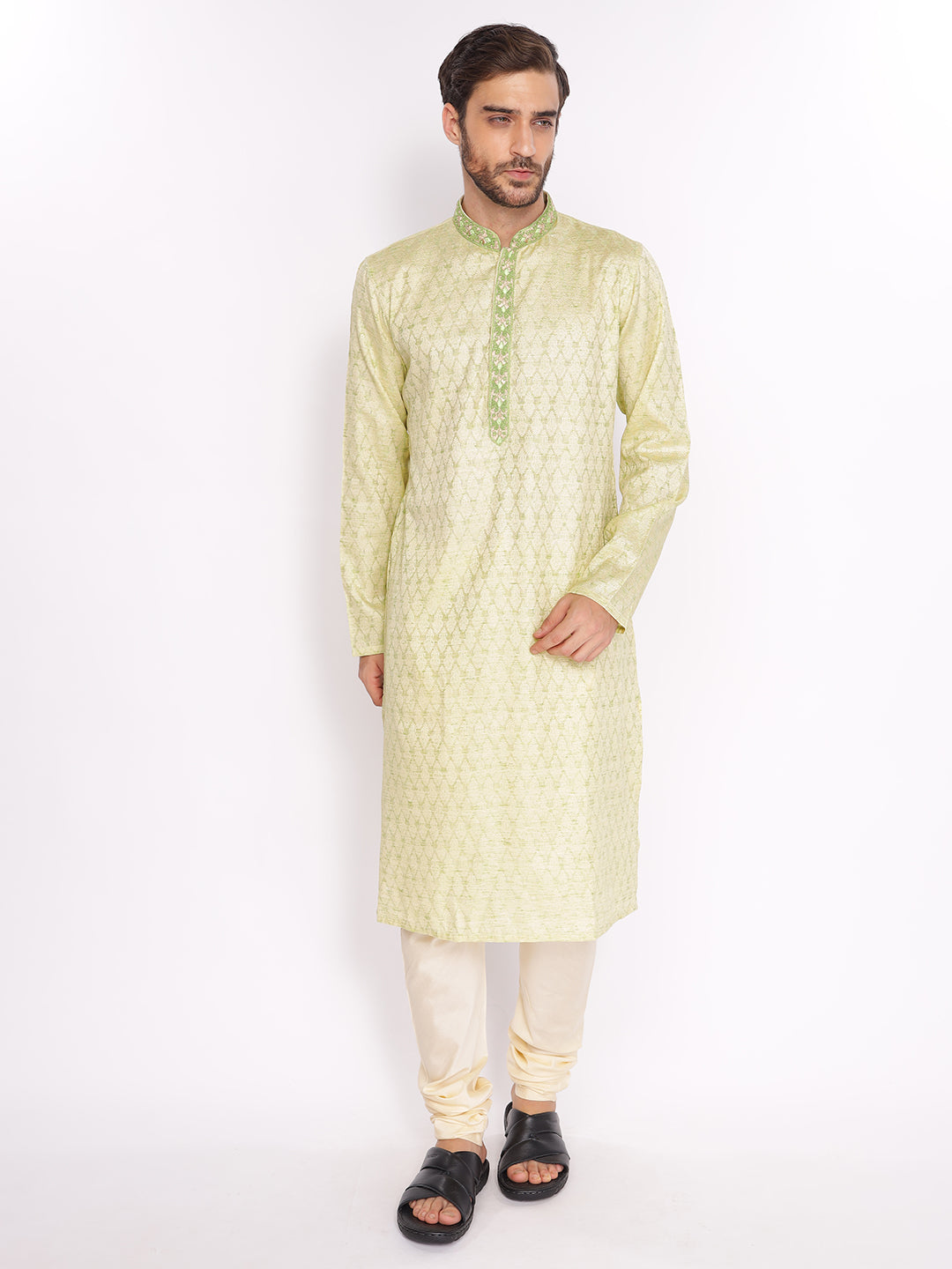 Full Sleeve Self Design Kurta and Pyjama Set in Green Silk Blend