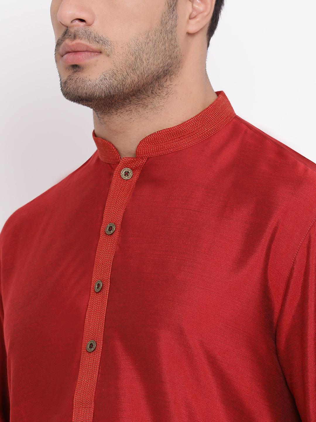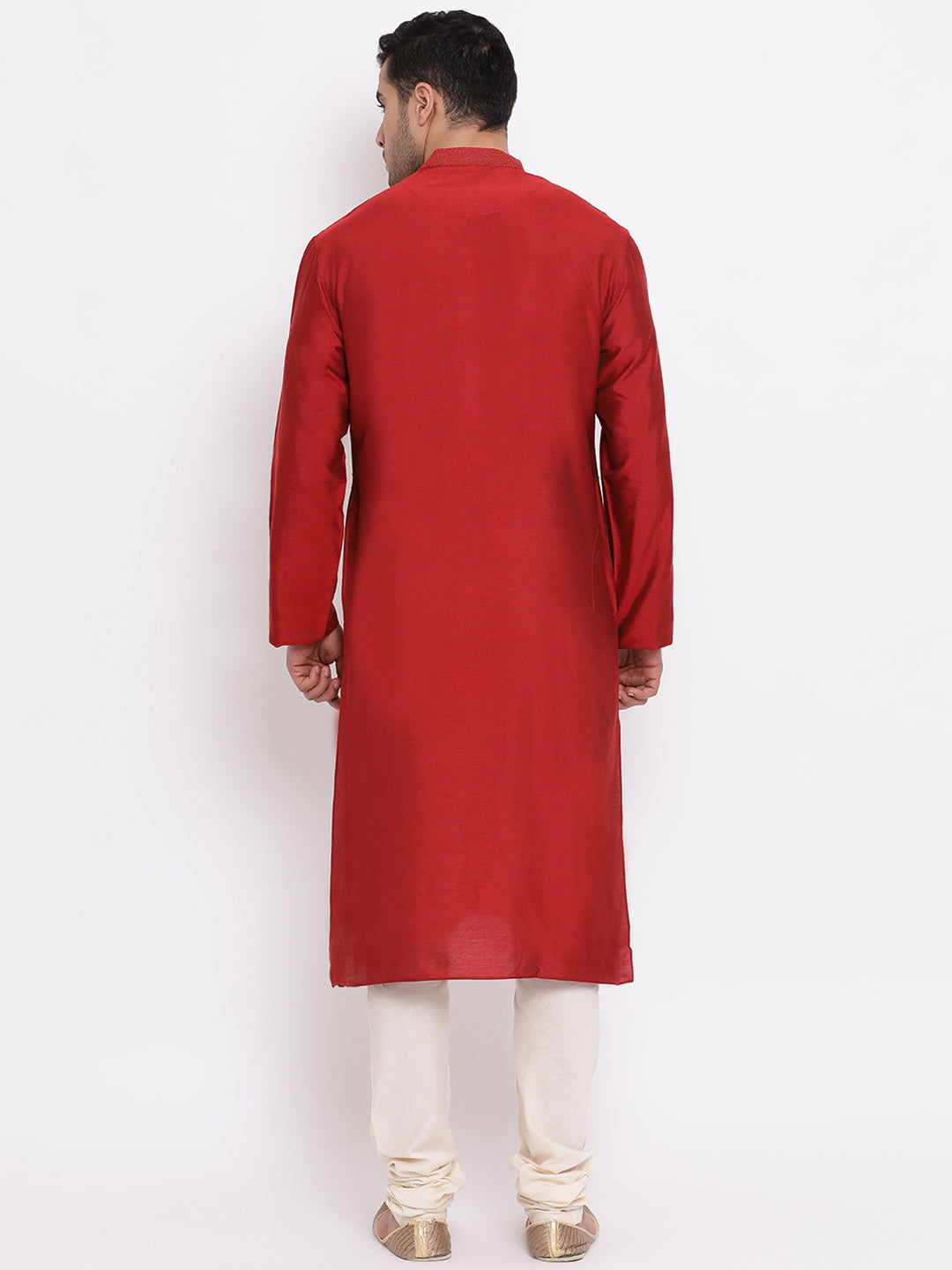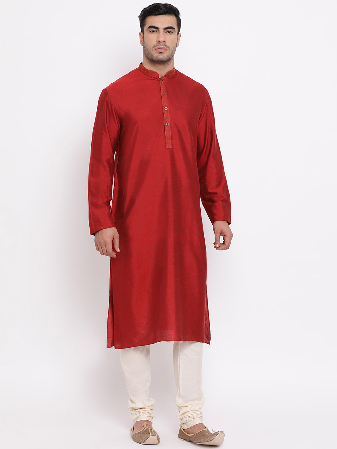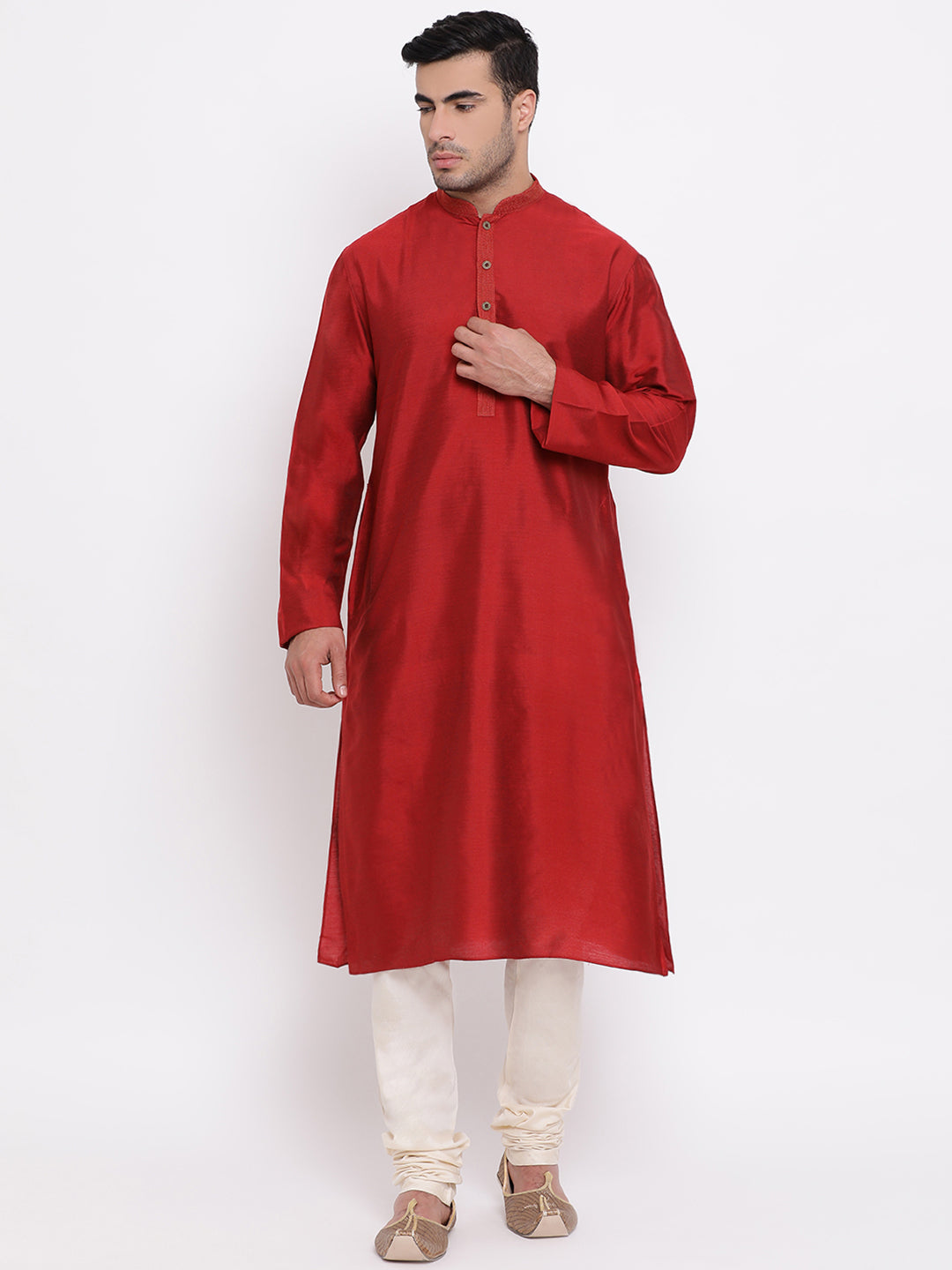 Full Sleeve Solid Kurta and Churidar Set in Red Silk Blend