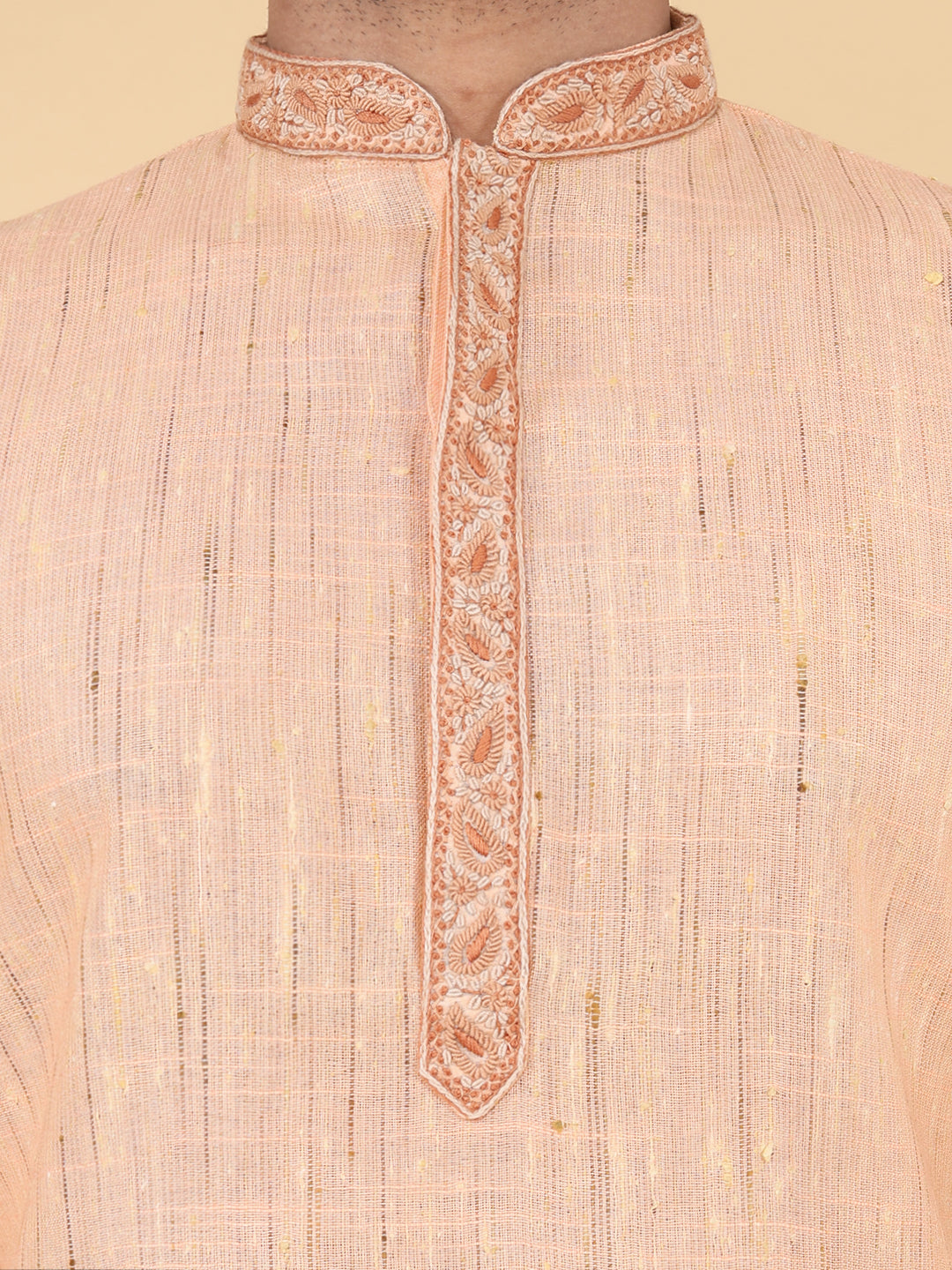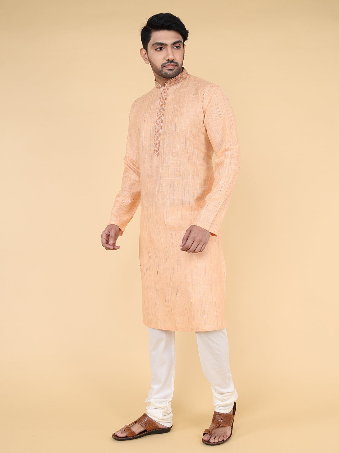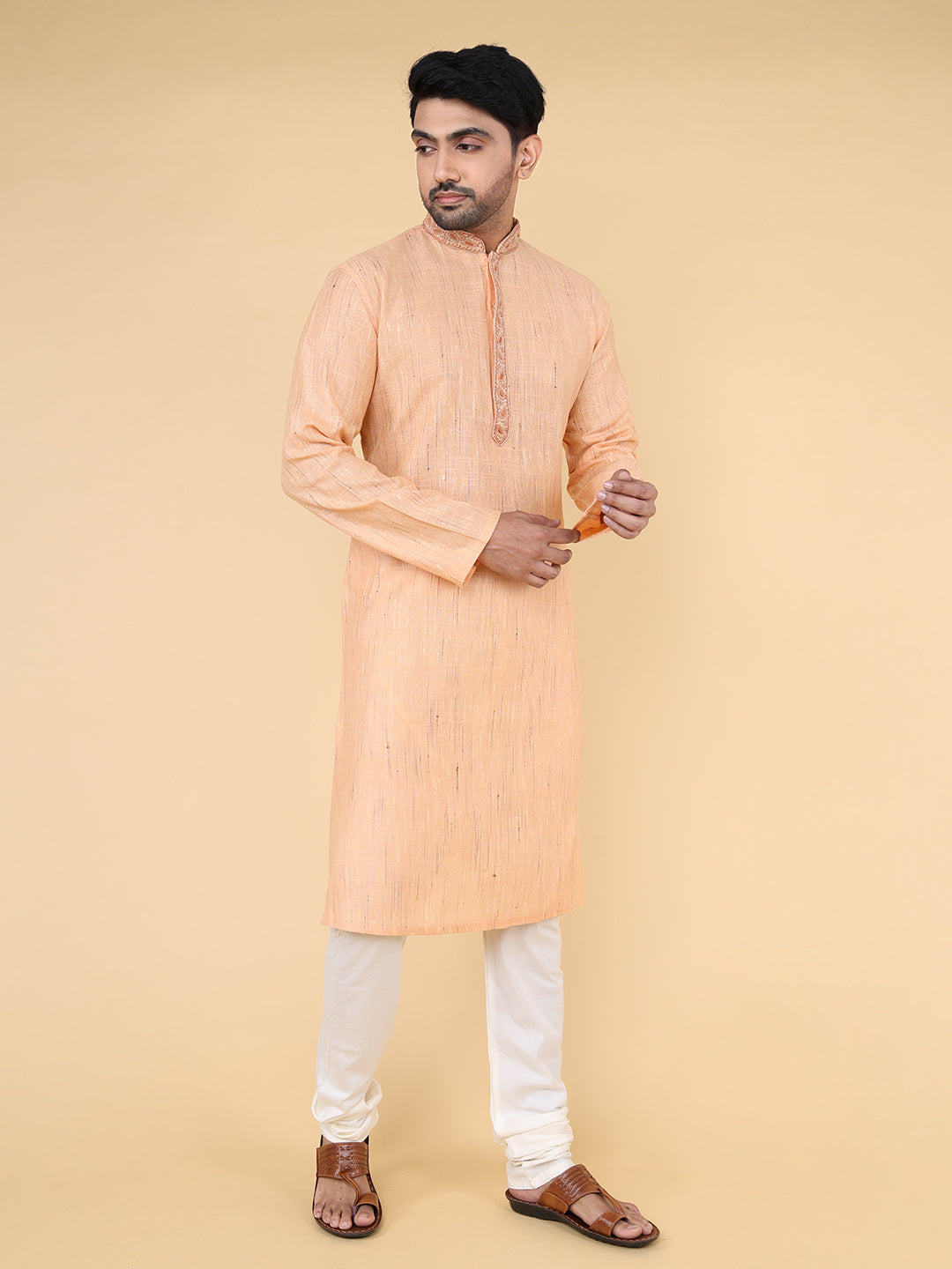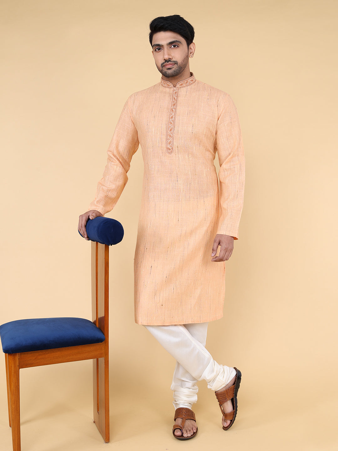 Presenting our meticulously crafted Men's Kurta, reflecting ZOIS's commitment to high-quality fashion. Featuring intricate hand embroidery and a touch of simplicity, this light orange Kurta in Khadi Cotton fabric exudes elegance. The Mandarin collar adds sophistication, perfectly embodying the simplicity at the heart of our design philosophy. With ZOIS, embrace the fusion of tradition and contemporary style in this versatile ethnic wear.