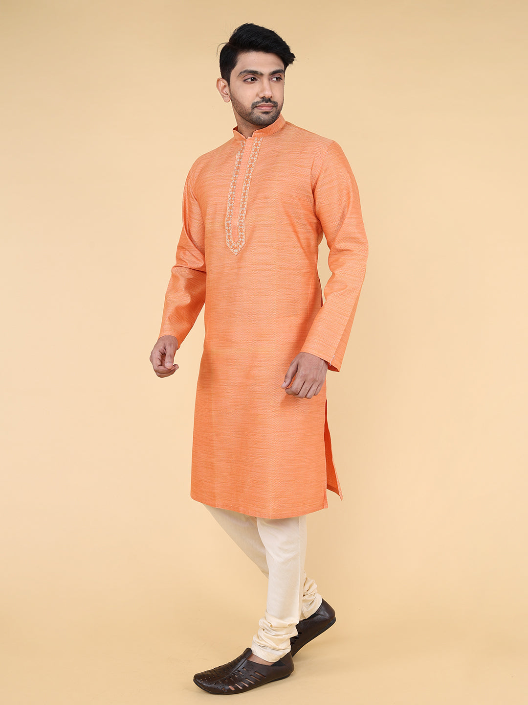 Presenting our meticulously crafted Men's Kurta Pyjama Set, showcasing ZOIS's dedication to premium fashion. This Orange ensemble, made from Khadi Cotton, features intricate hand embroidery combined with a minimalist design for an elegant yet comfortable look. The Mandarin collar adds a refined touch, reflecting the simplicity at the core of our design philosophy. With ZOIS, experience the perfect blend of tradition and contemporary style in this versatile ethnic wear.