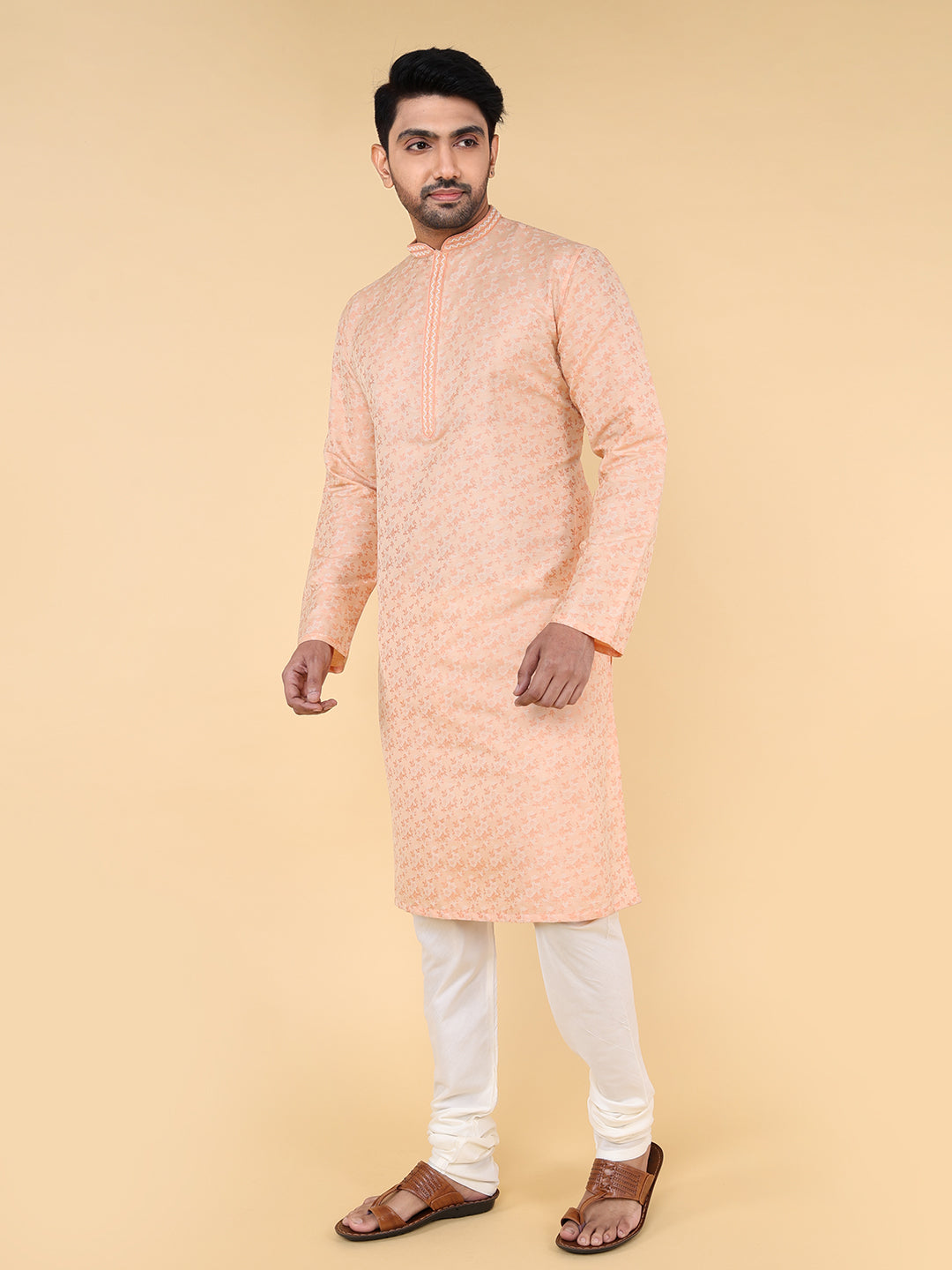 Presenting our meticulously crafted Men's Kurta Pyjama Set, showcasing ZOIS's dedication to premium fashion. This Peach ensemble, made from Khadi Cotton, features intricate hand embroidery combined with a minimalist design for an elegant yet comfortable look. The Mandarin collar adds a refined touch, reflecting the simplicity at the core of our design philosophy. With ZOIS, experience the perfect blend of tradition and contemporary style in this versatile ethnic wear.