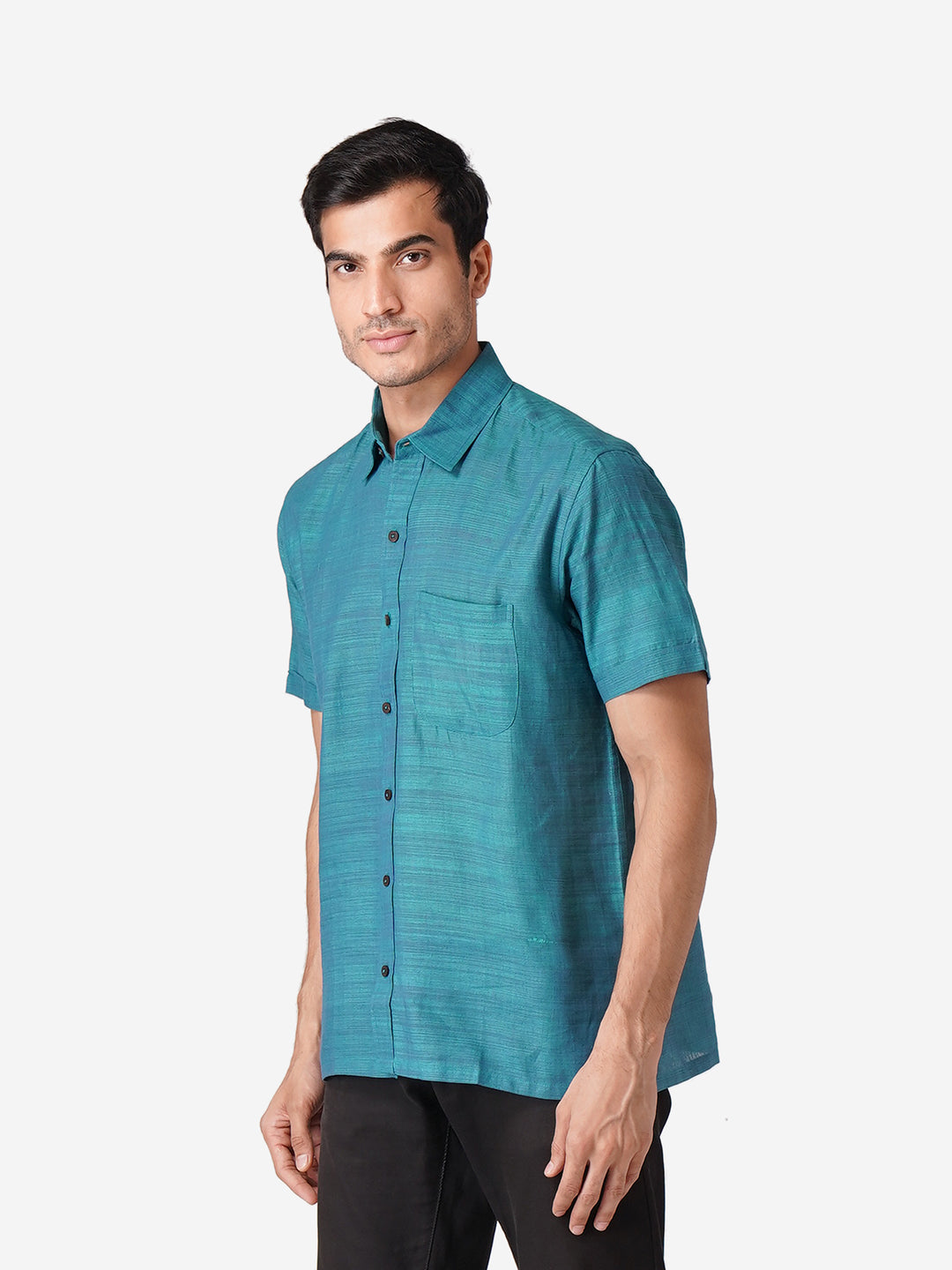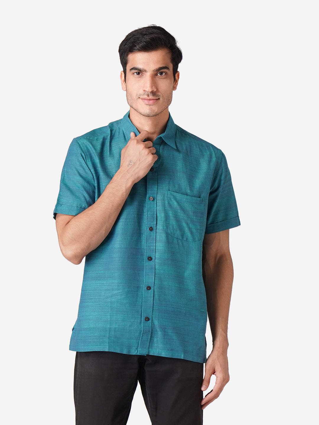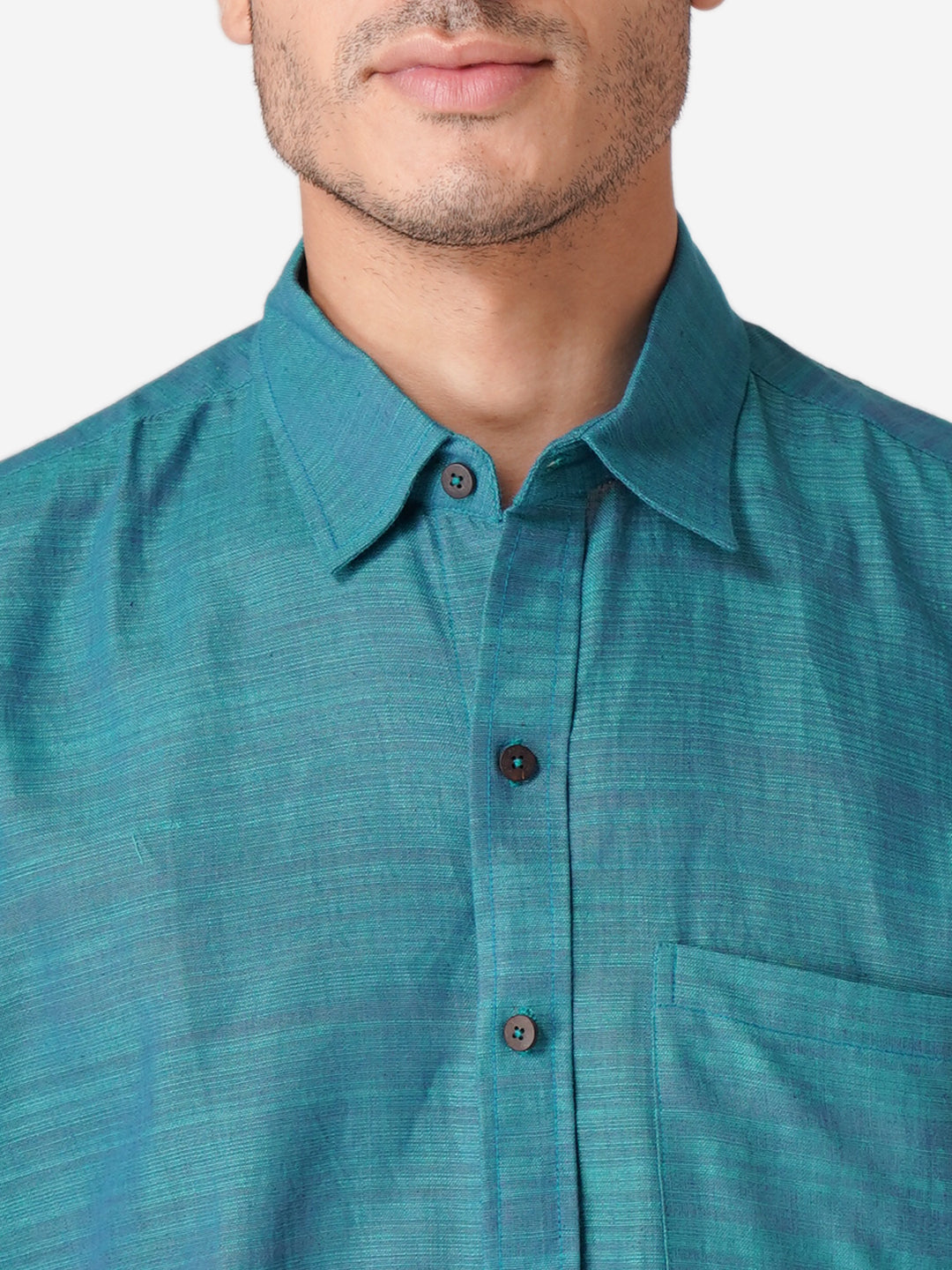 Introducing our meticulously crafted men's shirt, designed with an unwavering commitment to high-quality fashion. Embrace elegance through the simplicity of this Self Designed Blue shirt, perfect for casual occasions. Rooted in cultural authenticity, our contemporary design creates a unique fusion. Made from pure cotton, this half-sleeve shirt with a classic collar mirrors our dedication to men's ethnic wear elegance