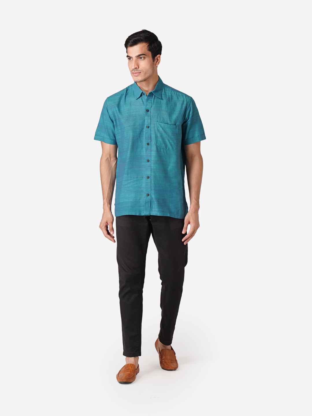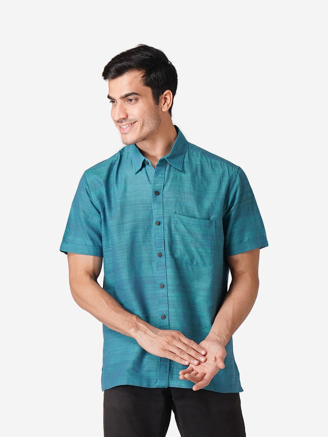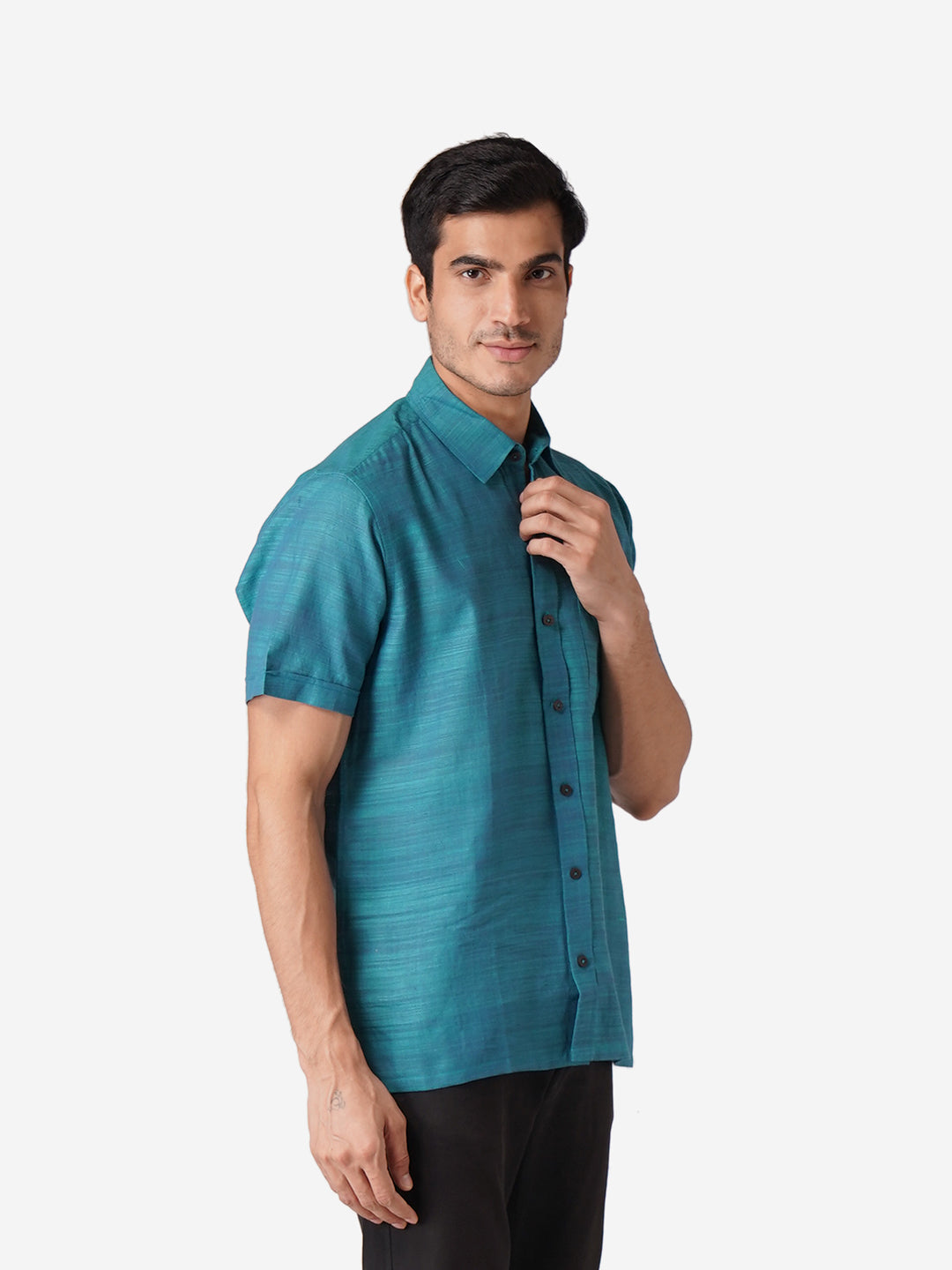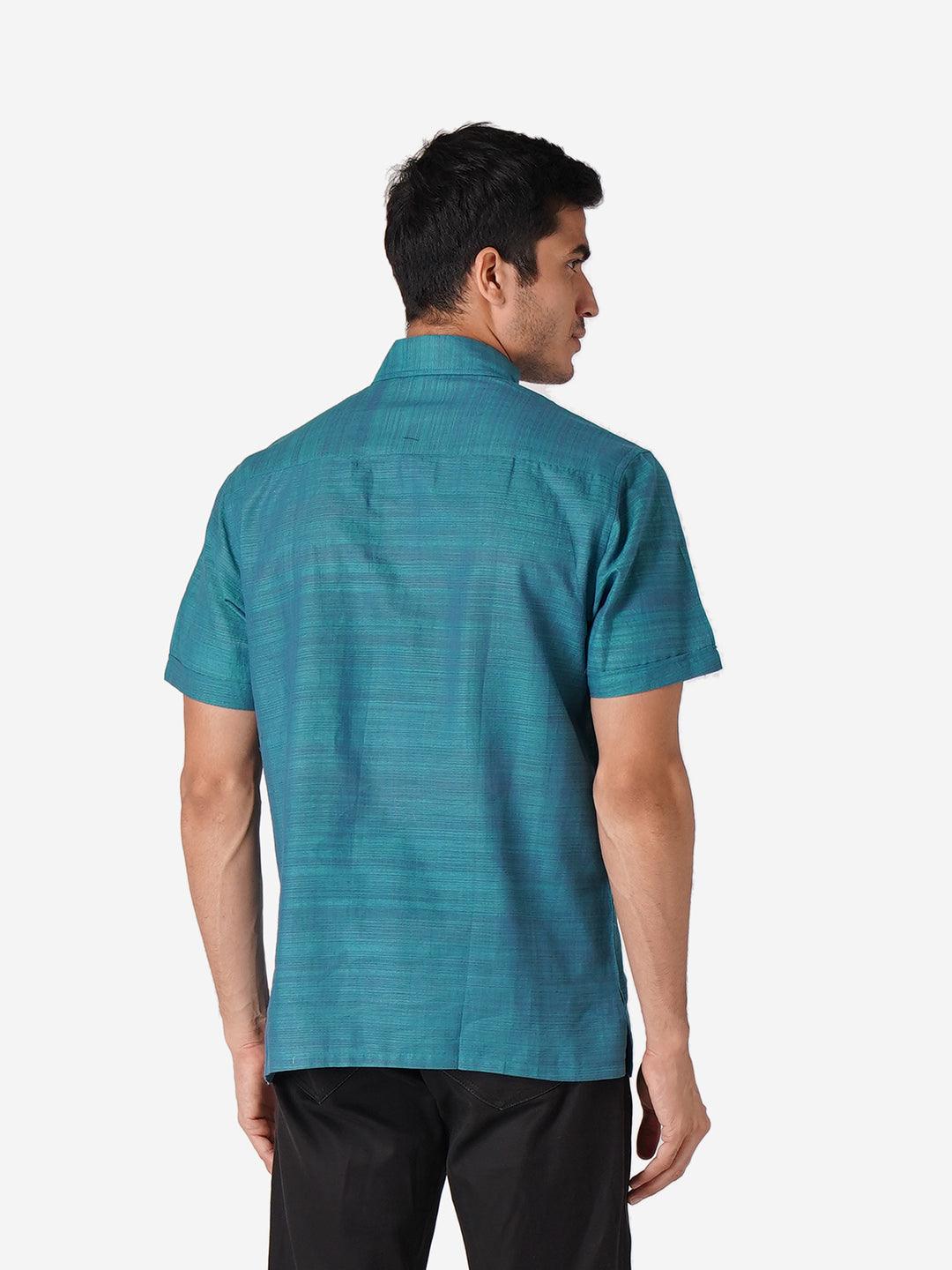Introducing our meticulously crafted men's shirt, designed with an unwavering commitment to high-quality fashion. Embrace elegance through the simplicity of this Self Designed Blue shirt, perfect for casual occasions. Rooted in cultural authenticity, our contemporary design creates a unique fusion. Made from pure cotton, this half-sleeve shirt with a classic collar mirrors our dedication to men's ethnic wear elegance