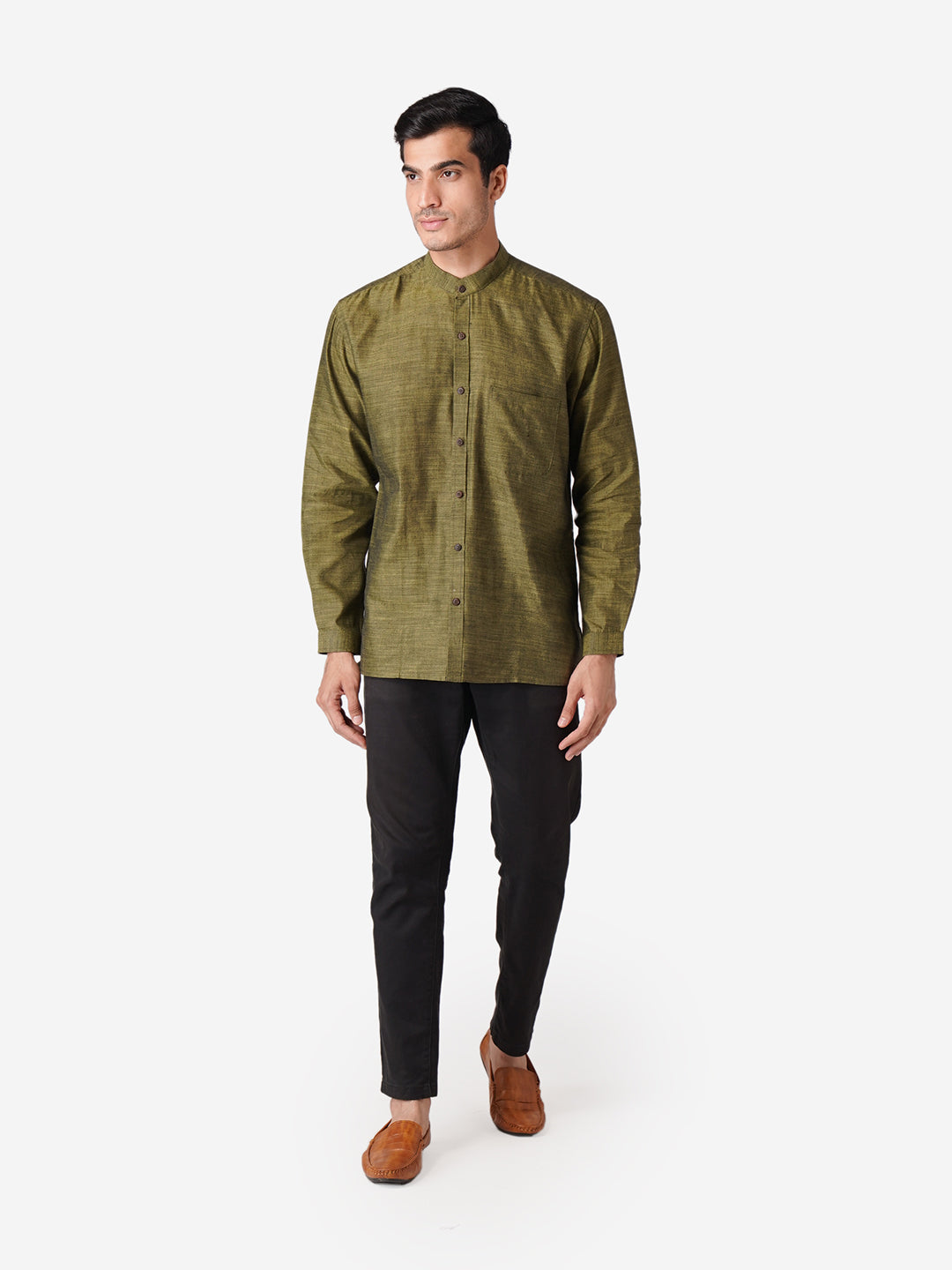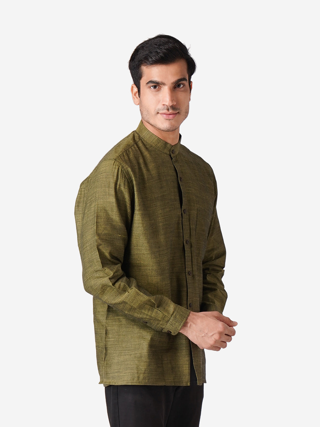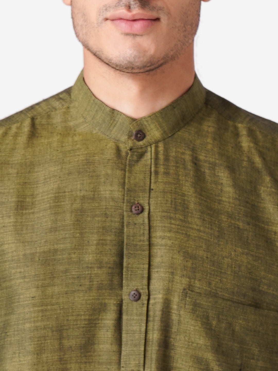 Introducing our meticulously crafted men's shirt, designed with an unwavering commitment to high-quality fashion. Embrace elegance through the simplicity of this Self Designed Green shirt, perfect for casual occasions. Rooted in cultural authenticity, our contemporary design creates a unique fusion. Made from pure cotton, this half-sleeve shirt with a classic collar mirrors our dedication to men's ethnic wear elegance